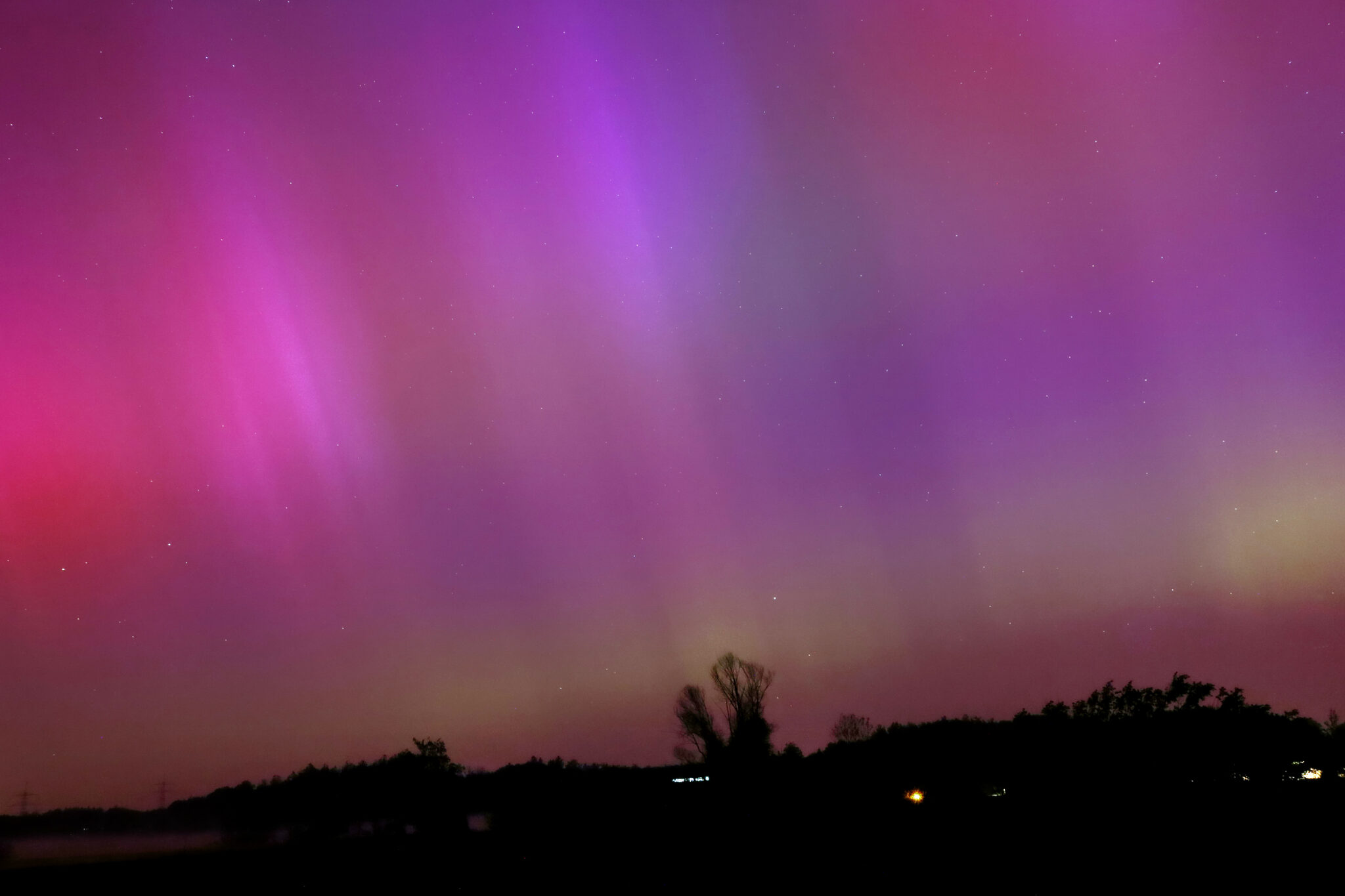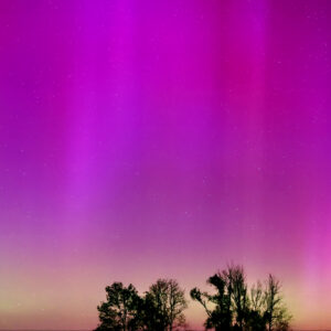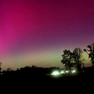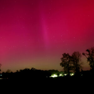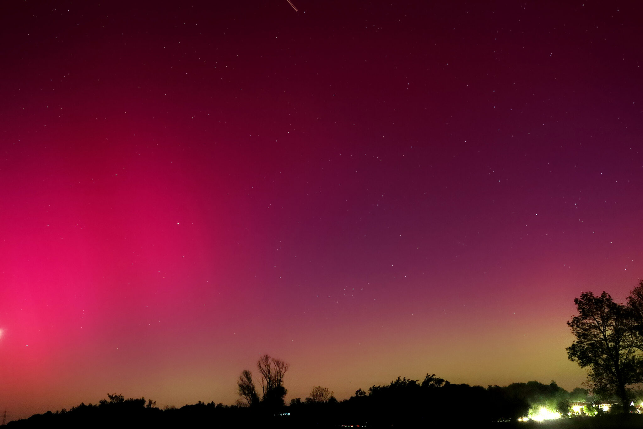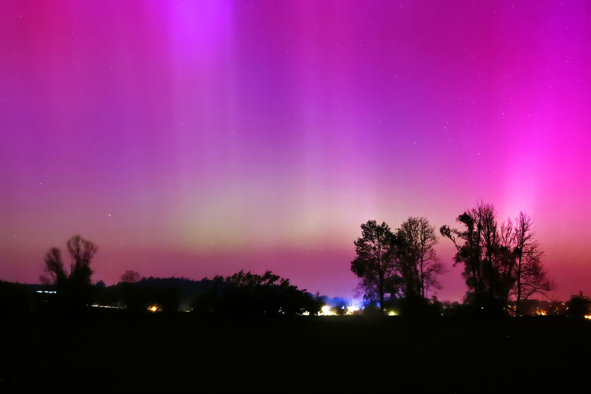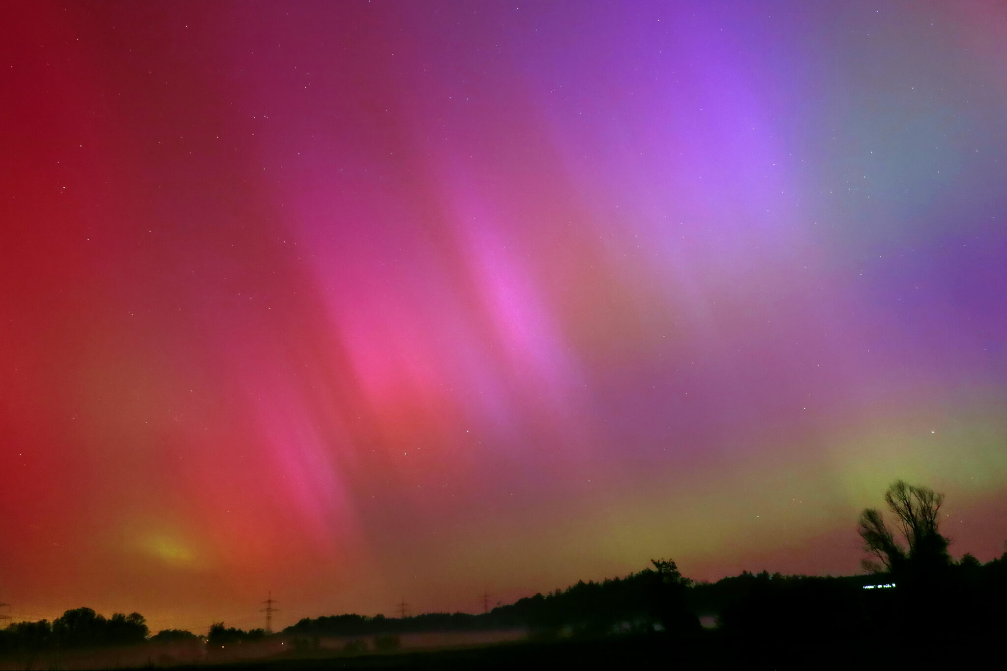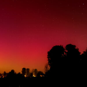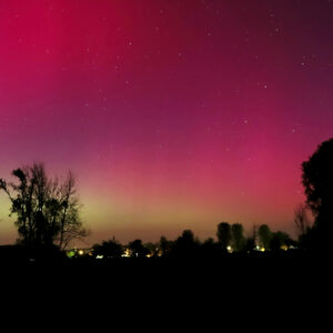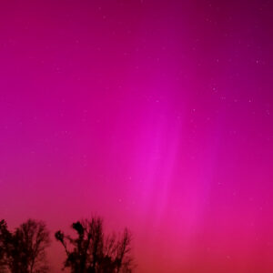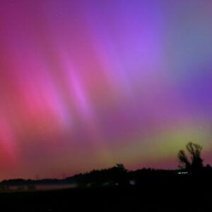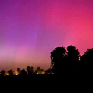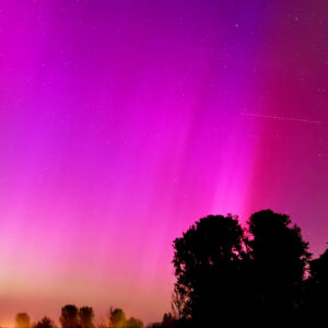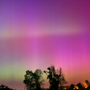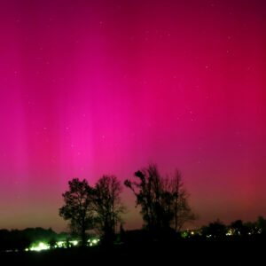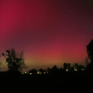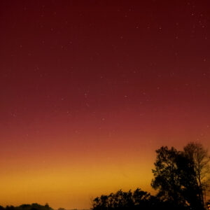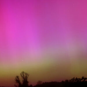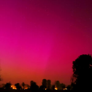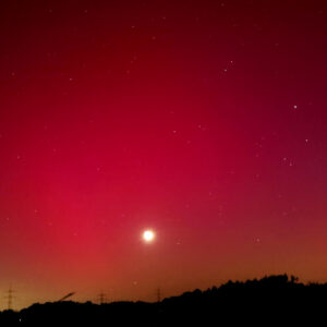 As a result of the strong interaction of the solar wind with the Earth’s magnetic field, aurorae have been observed far outside the usual polar regions. In Central Europe and parts of Germany, distinct auroral emissions were visible, primarily in the red spectral range (oxygen emission at 630.0 nm), locally supplemented by greenish structures (557.7 nm). Even in Germany, the phenomena were visible to the naked eye. The intensity, duration, and geographical extent of this event make the aurora night of 10/11. May 2024 will be one of the most significant aurora events in the past few decades in mid-latitudes. With a Canon 750D and an EFS 18-55mm wide-angle lens, I took around 300 individual shots that captured the fascinating play of colors in the sky, with red, violet, and green hues.