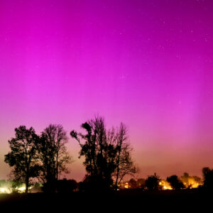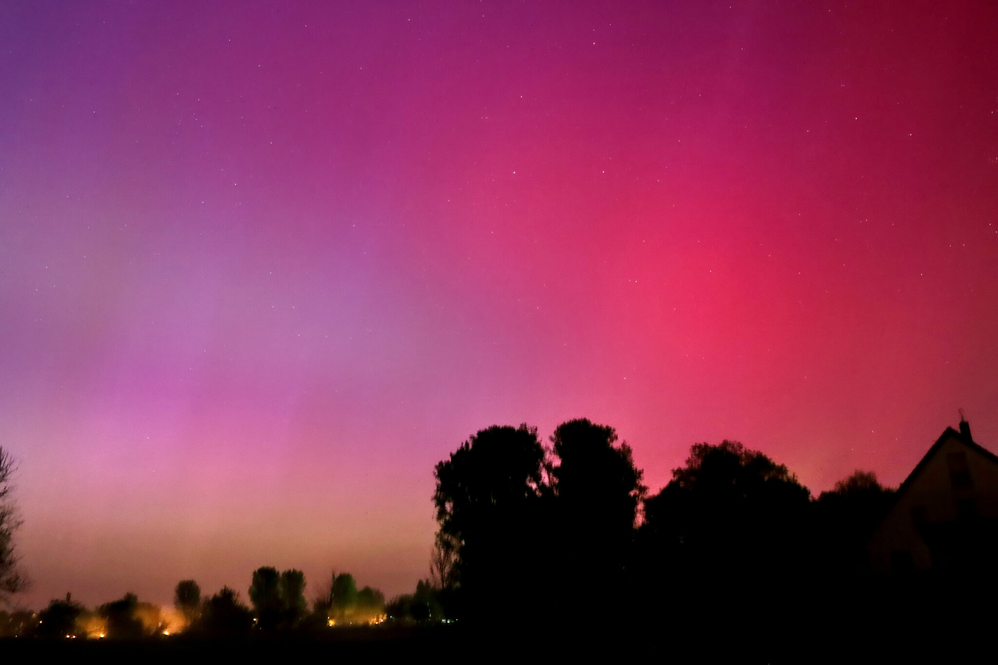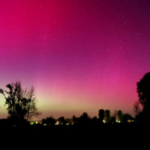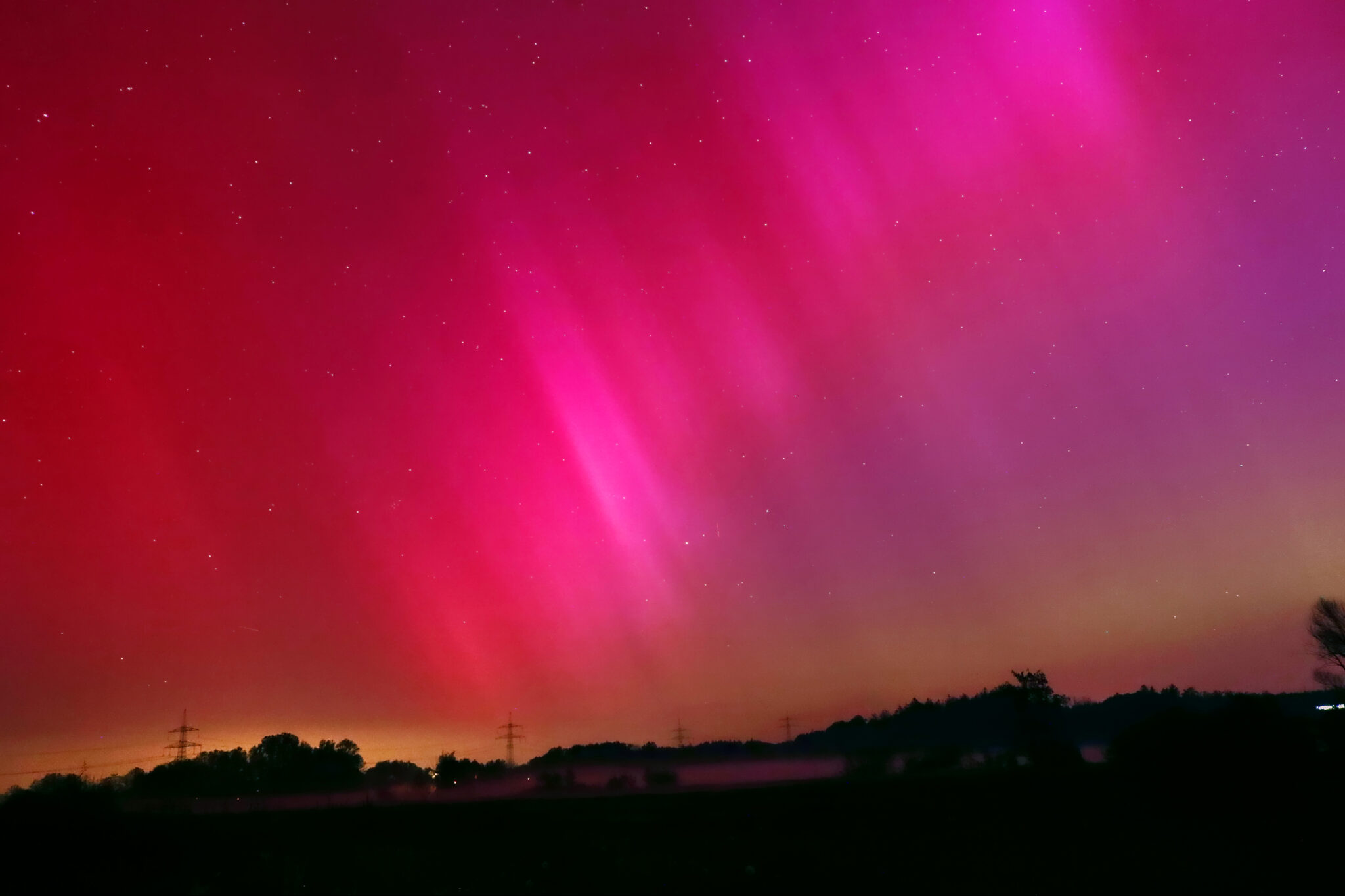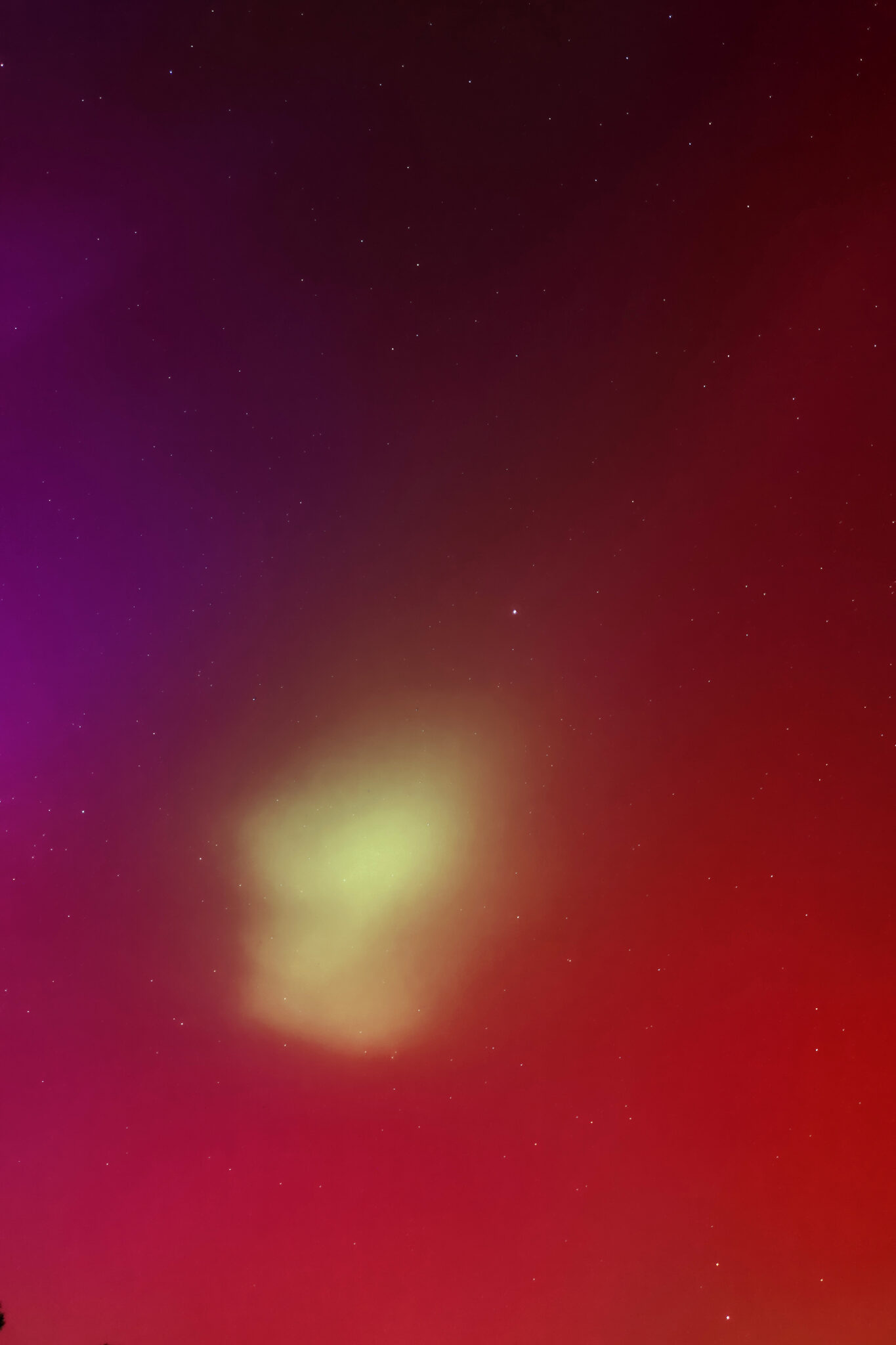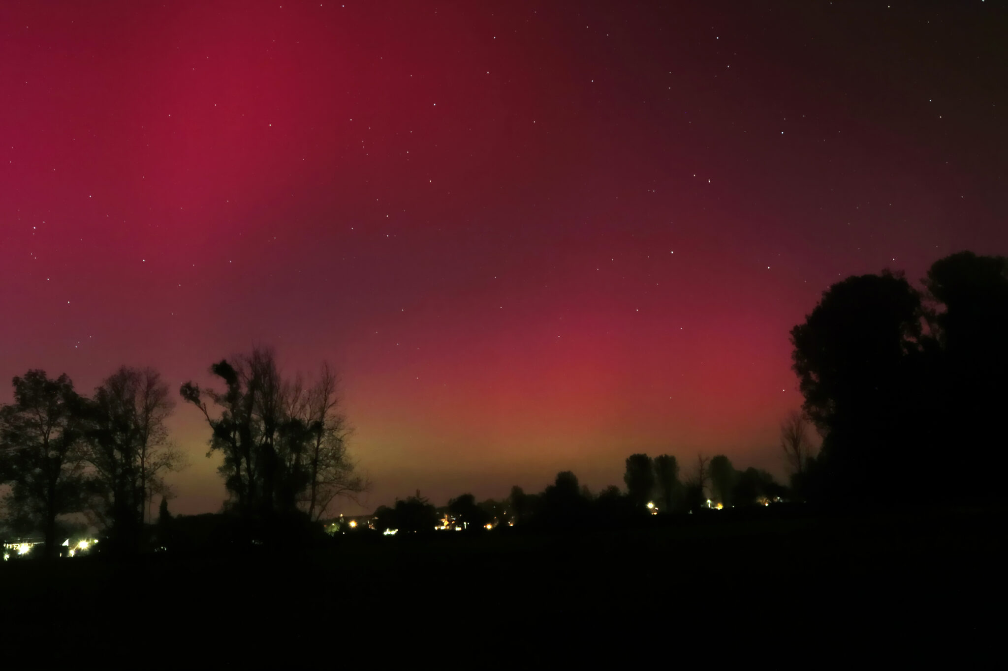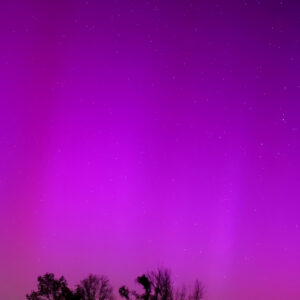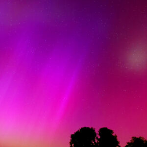 As a result of the strong interaction of the solar wind with the Earth’s magnetic field, aurorae have been observed far outside the usual polar regions. In Central Europe and parts of Germany, distinct auroral emissions were visible, primarily in the red spectral range (oxygen emission at 630.0 nm), locally supplemented by greenish structures (557.7 nm). Even in Germany, the phenomena were visible to the naked eye. The intensity, duration, and geographical extent of this event make the aurora night of 10/11. May 2024 will be one of the most significant aurora events in the past few decades in mid-latitudes. With a Canon 750D and an EFS 18-55mm wide-angle lens, I took around 300 individual shots that captured the fascinating play of colors in the sky, with red, violet, and green hues.