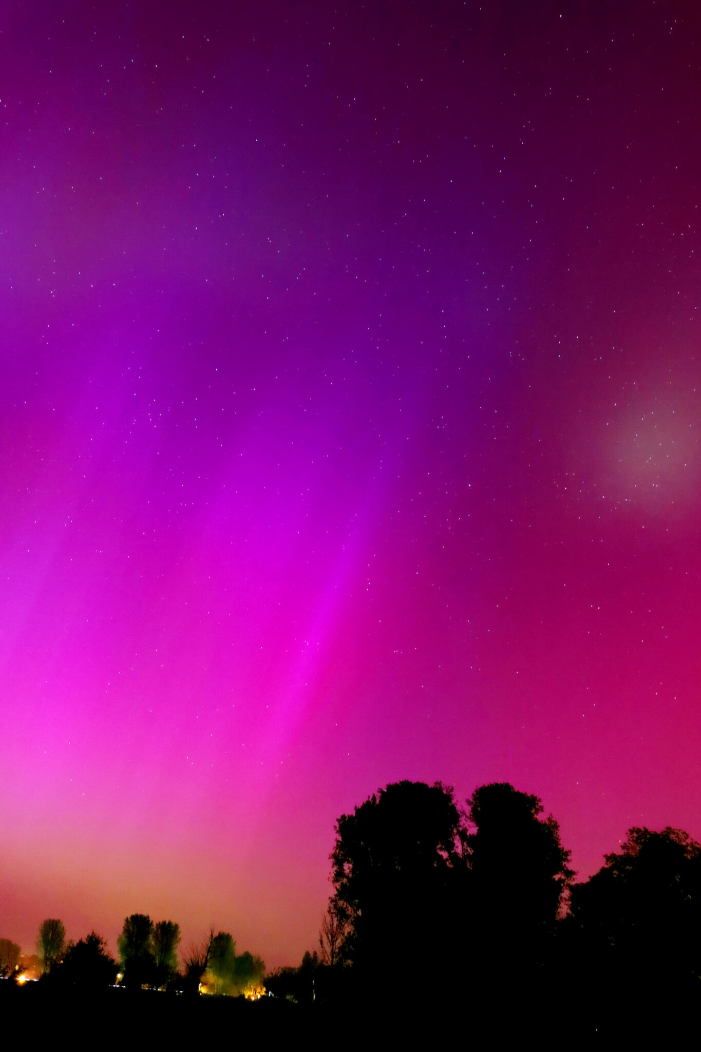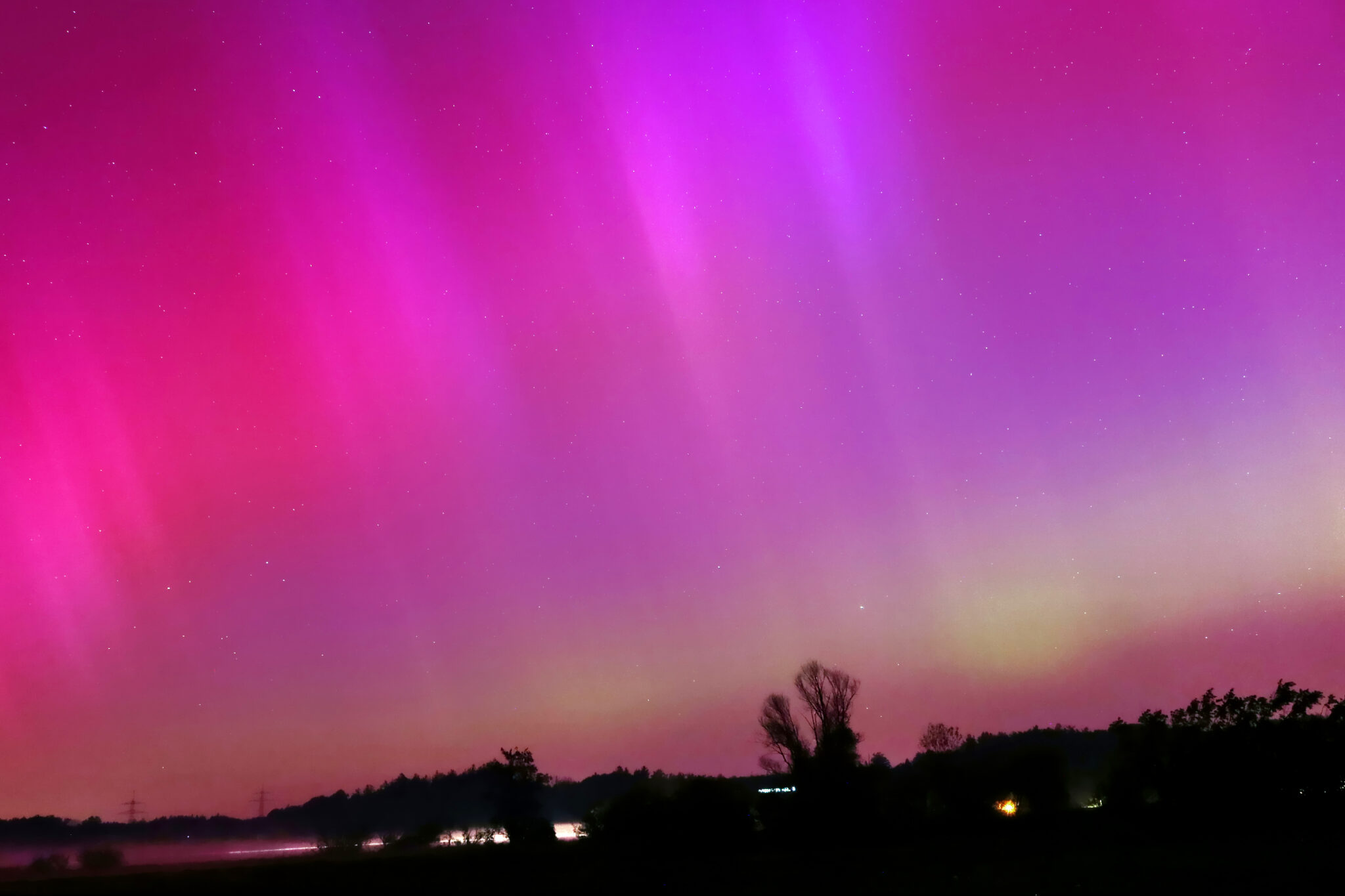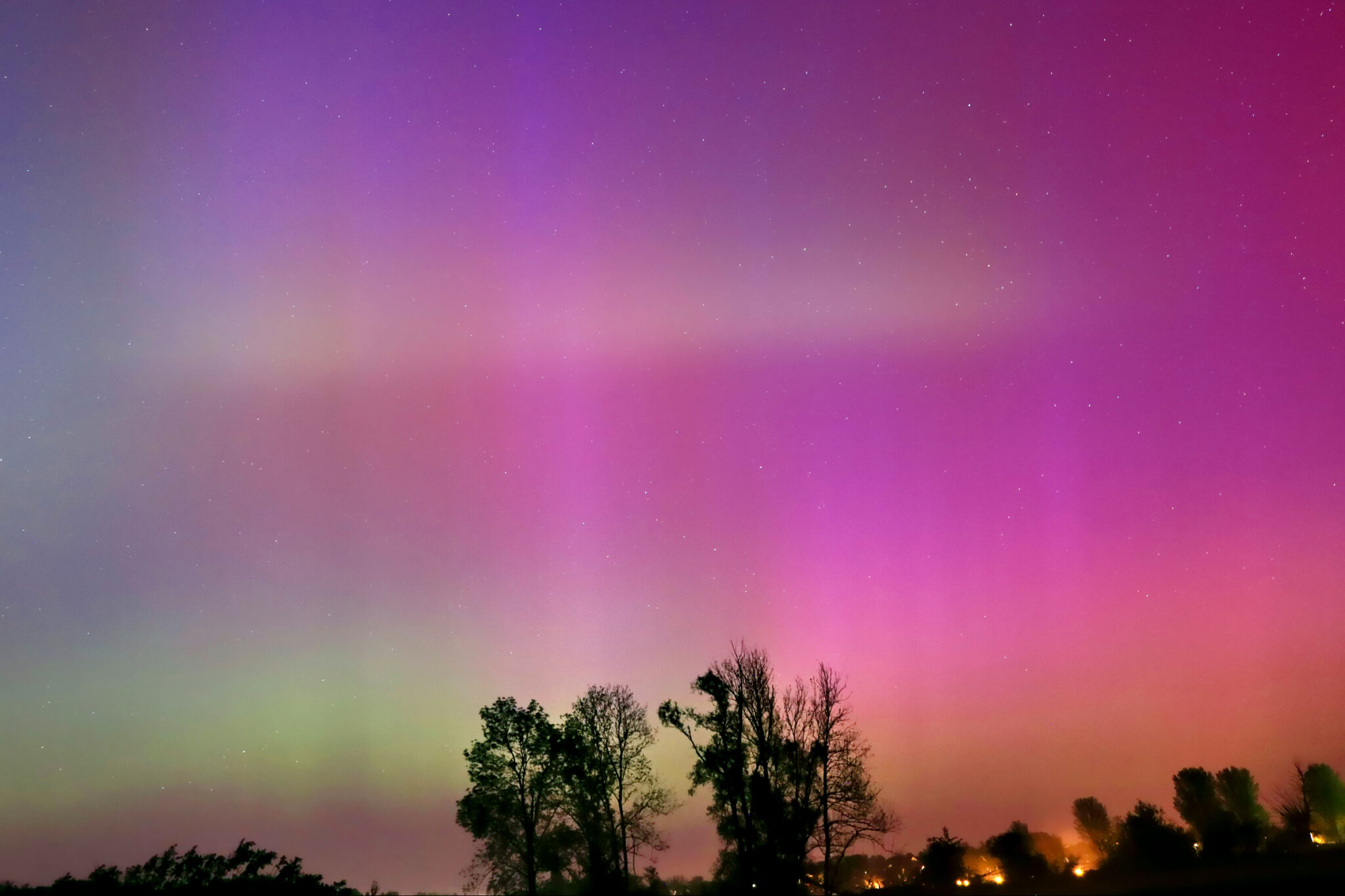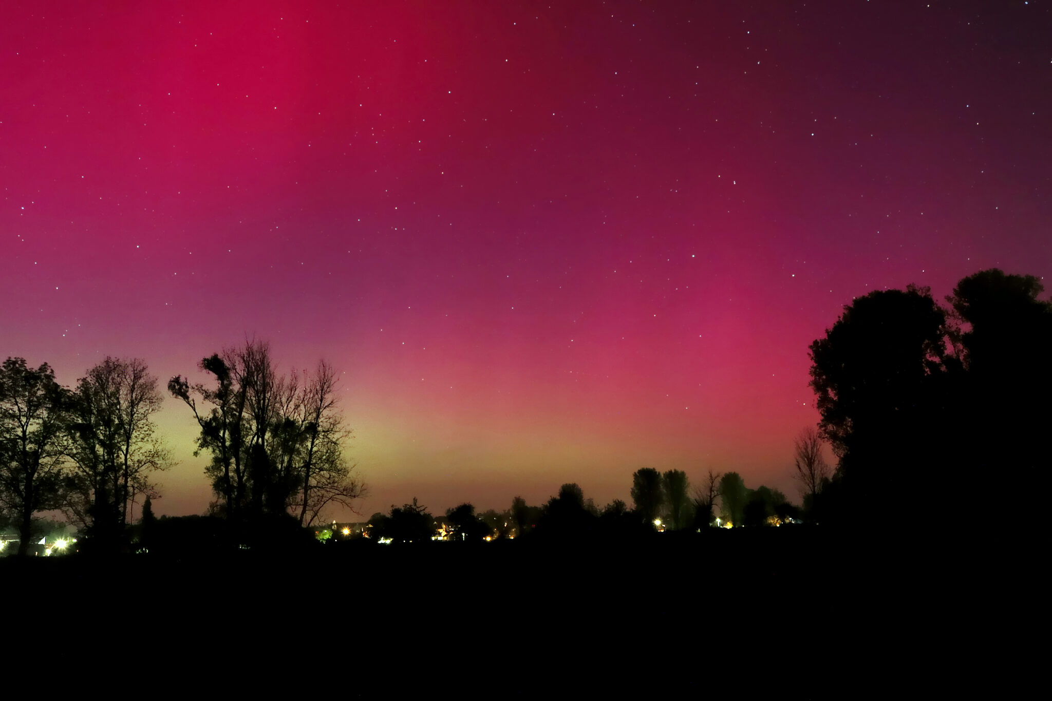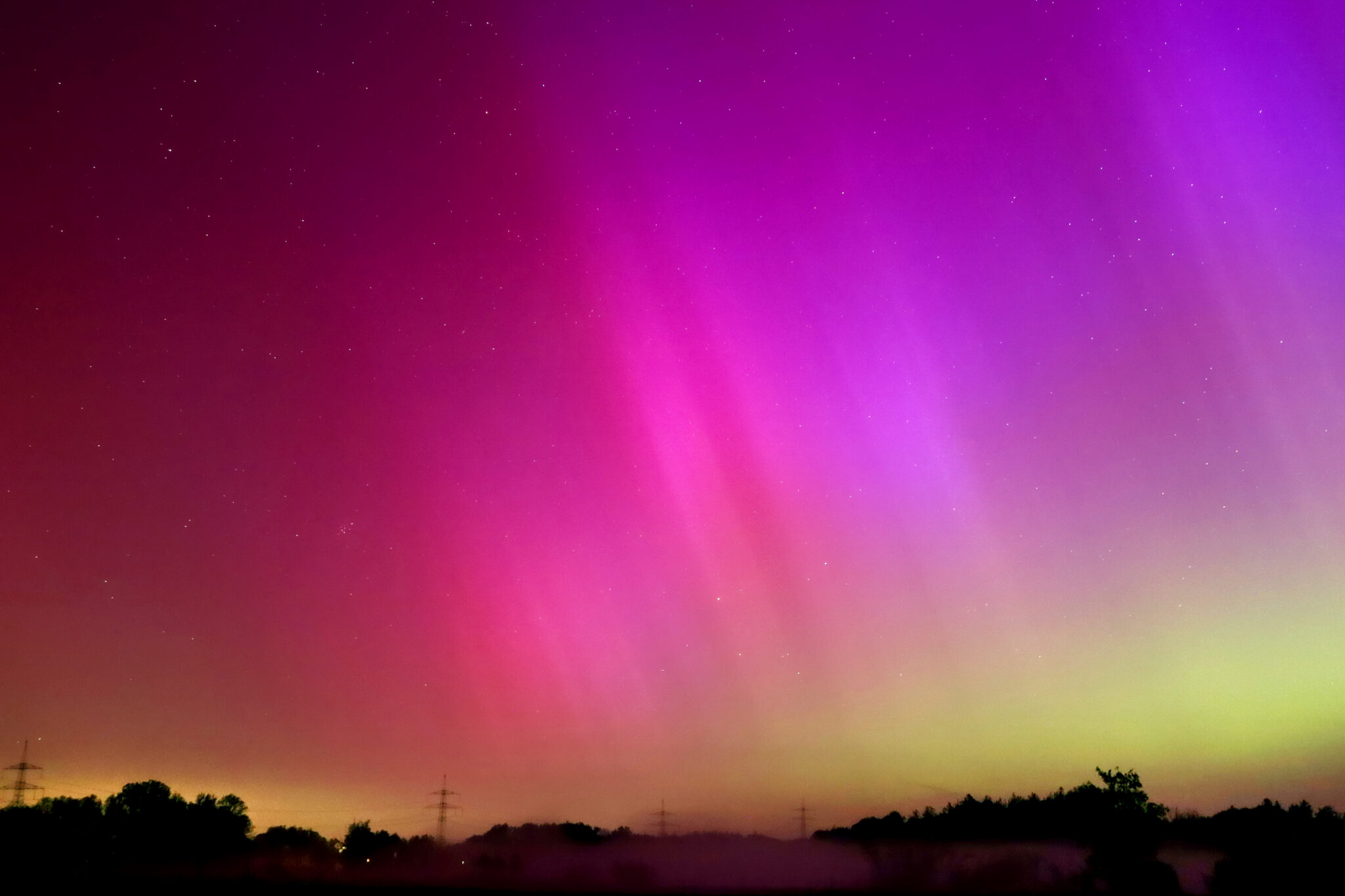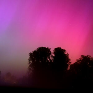 As a result of the strong interaction of the solar wind with the Earth’s magnetic field, aurorae have been observed far outside the usual polar regions. In Central Europe and parts of Germany, distinct auroral emissions were visible, primarily in the red spectral range (oxygen emission at 630.0 nm), locally supplemented by greenish structures (557.7 nm). Even in Germany, the phenomena were visible to the naked eye. The intensity, duration, and geographical extent of this event make the aurora night of 10/11. May 2024 will be one of the most significant aurora events in the past few decades in mid-latitudes. With a Canon 750D and an EFS 18-55mm wide-angle lens, I took around 300 individual shots that captured the fascinating play of colors in the sky, with red, violet, and green hues.