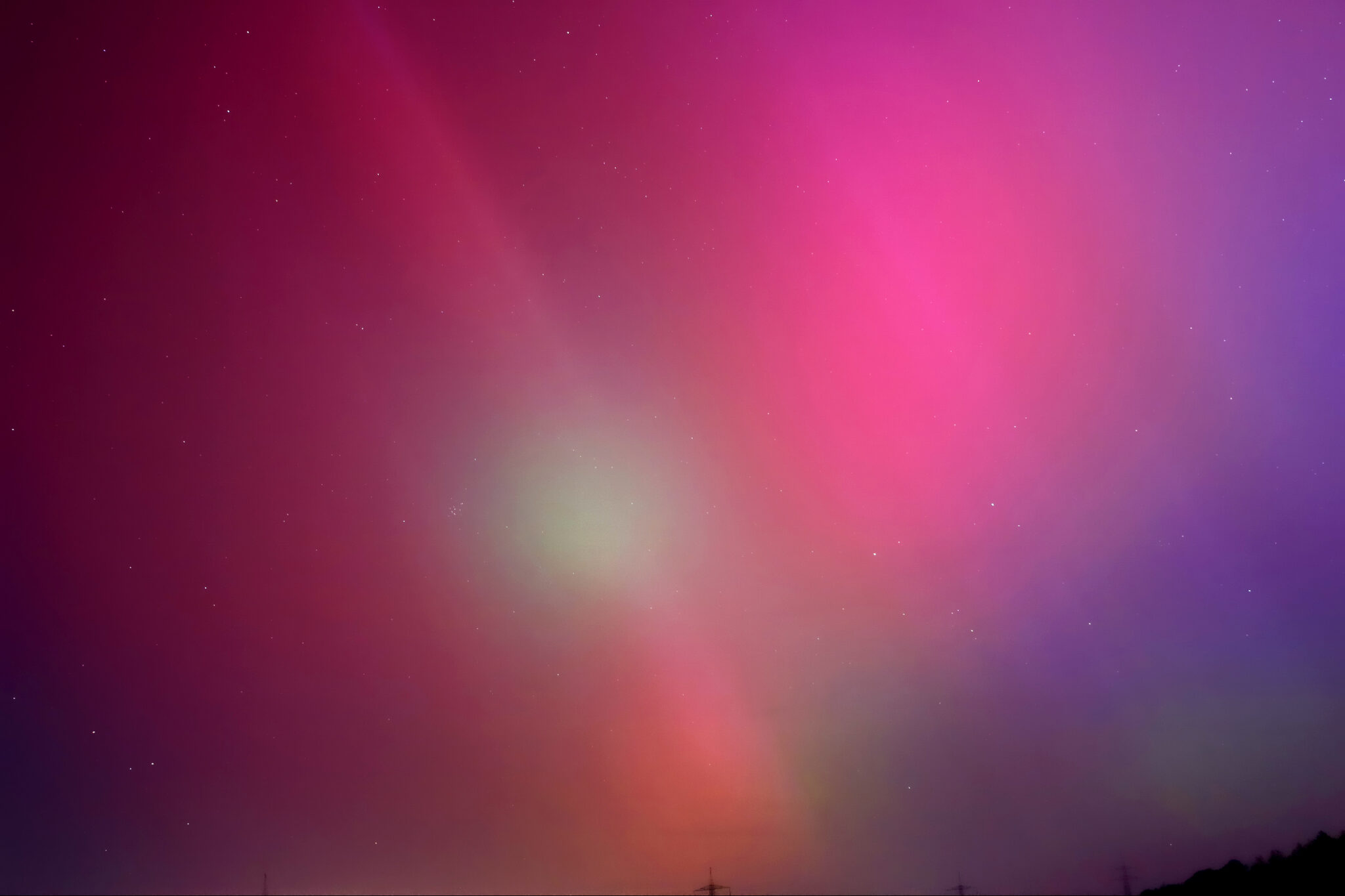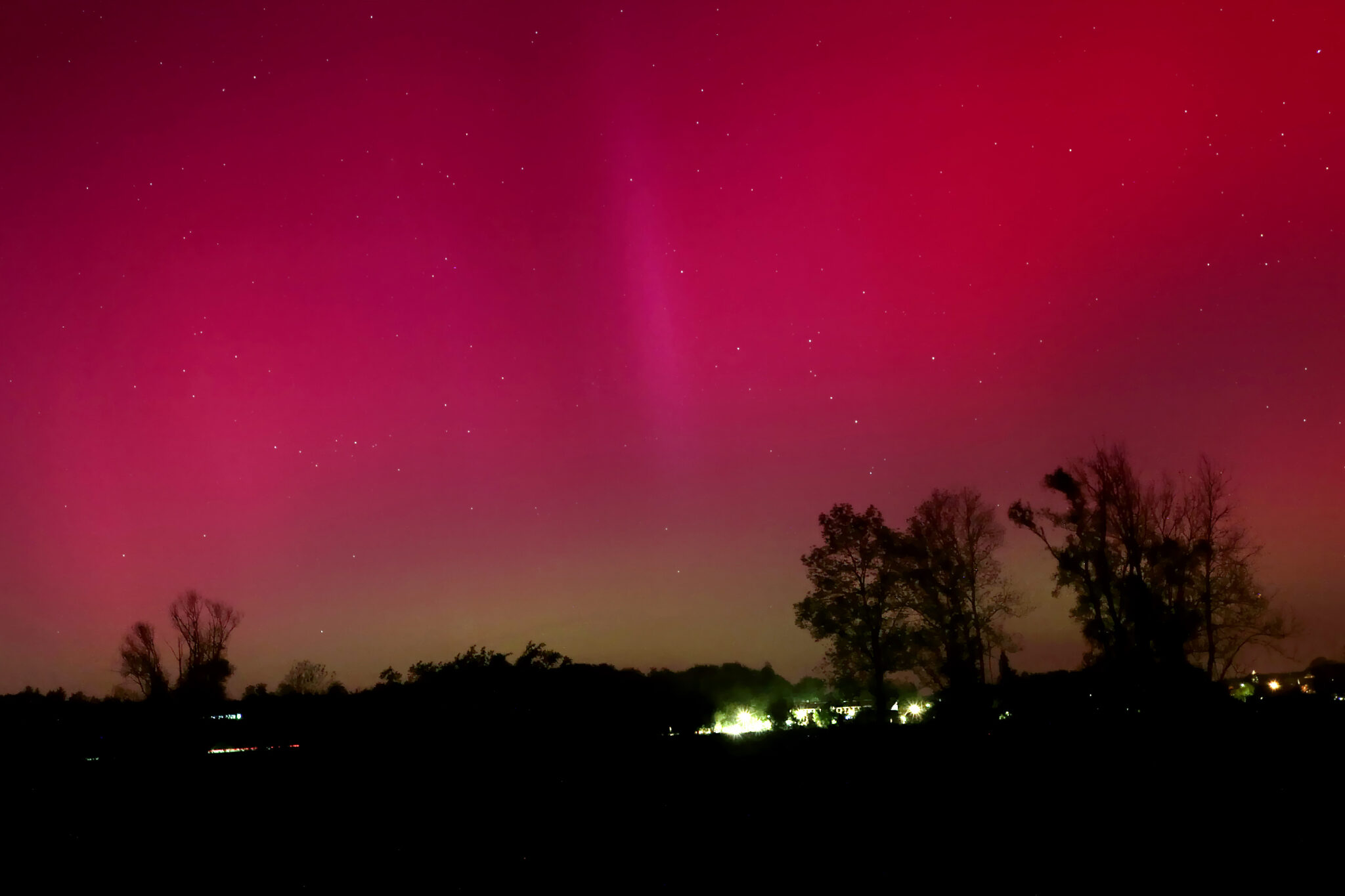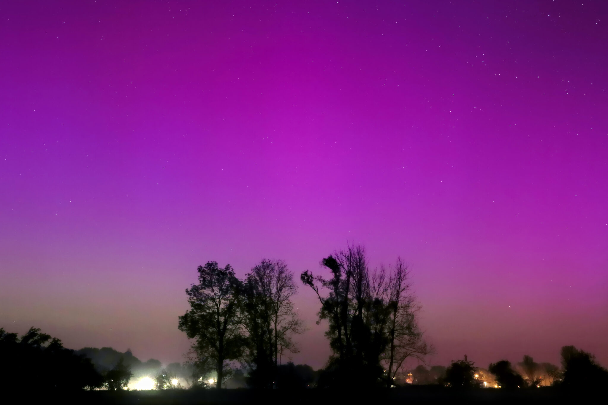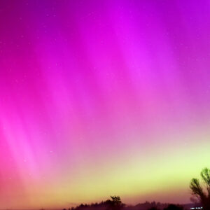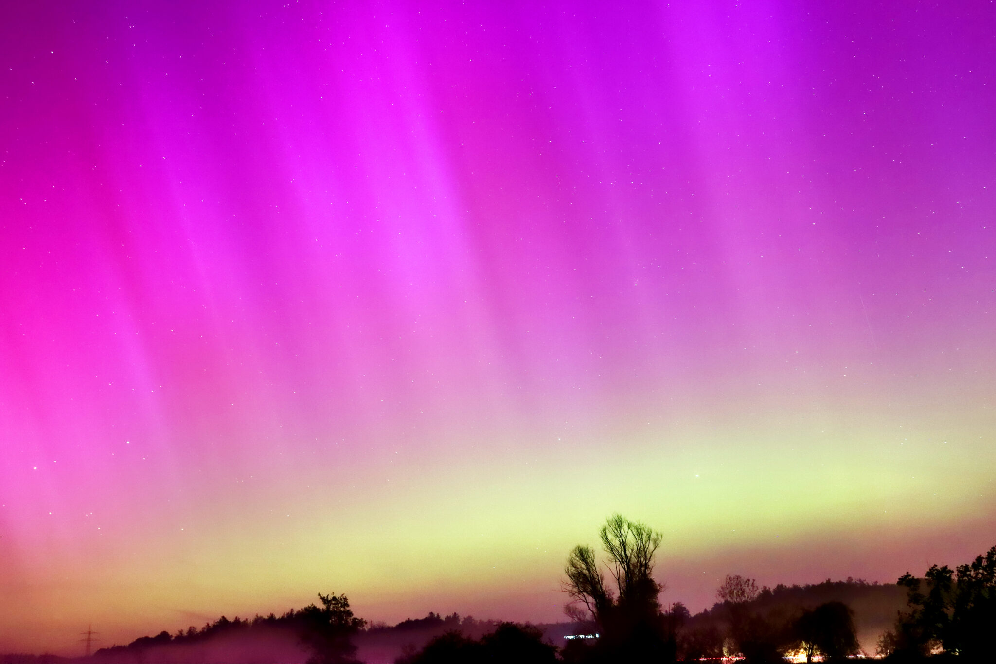 As a result of the strong interaction of the solar wind with the Earth’s magnetic field, aurorae have been observed far outside the usual polar regions. In Central Europe and parts of Germany, distinct auroral emissions were visible, primarily in the red spectral range (oxygen emission at 630.0 nm), locally supplemented by greenish structures (557.7 nm). Even in Germany, the phenomena were visible to the naked eye. The intensity, duration, and geographical extent of this event make the aurora night of 10/11. May 2024 will be one of the most significant aurora events in the past few decades in mid-latitudes. With a Canon 750D and an EFS 18-55mm wide-angle lens, I took around 300 individual shots that captured the fascinating play of colors in the sky, with red, violet, and green hues.