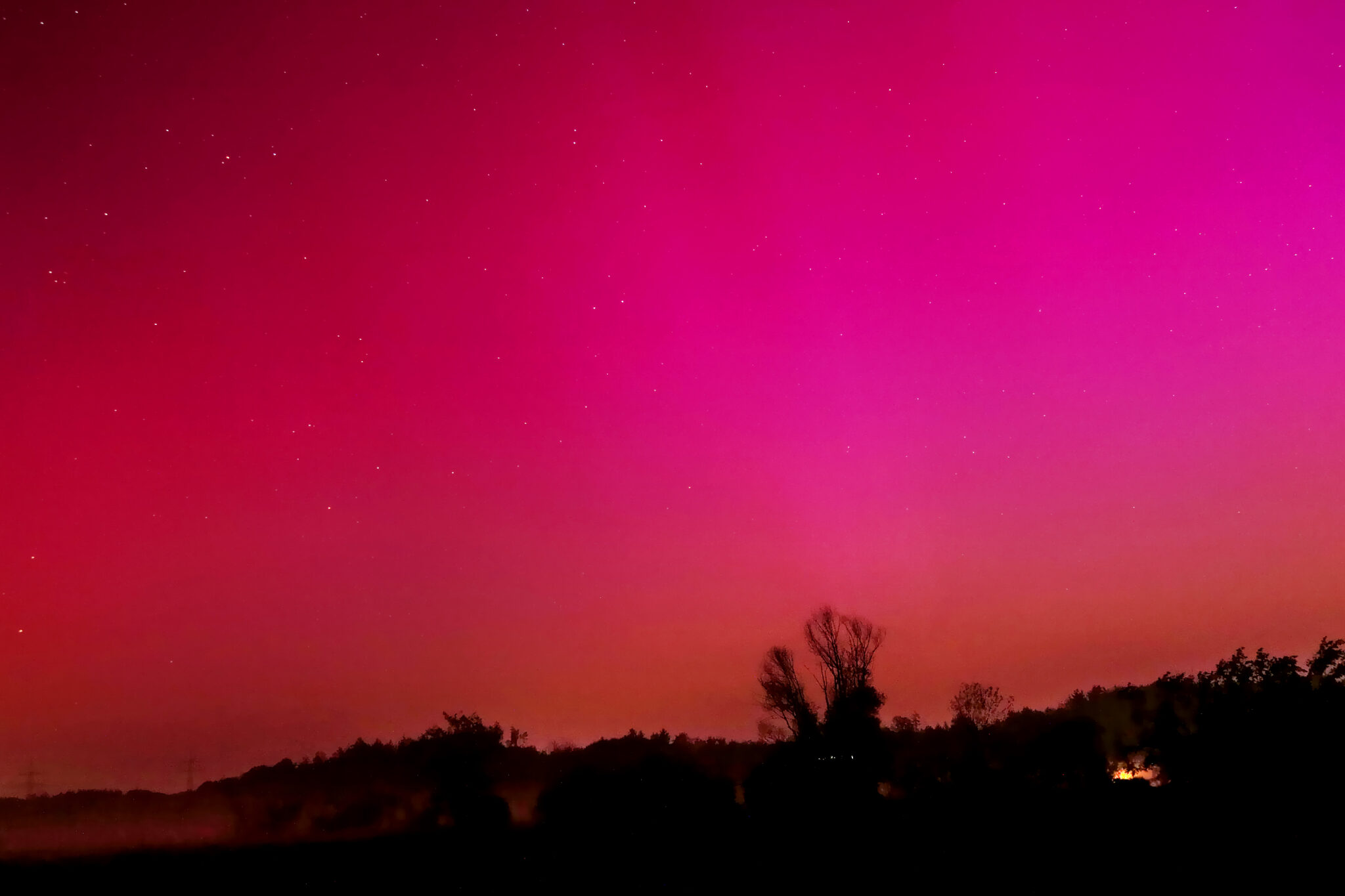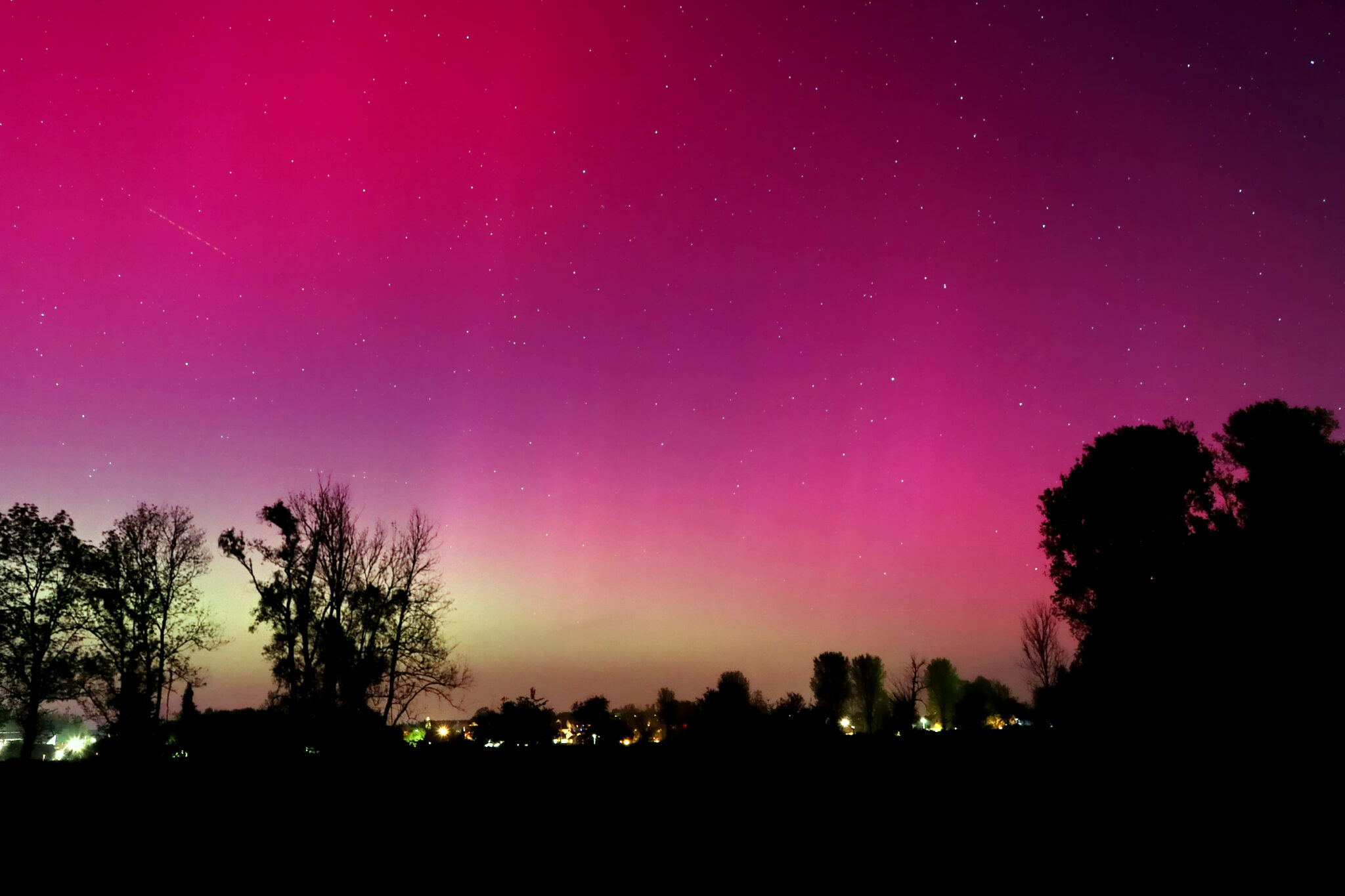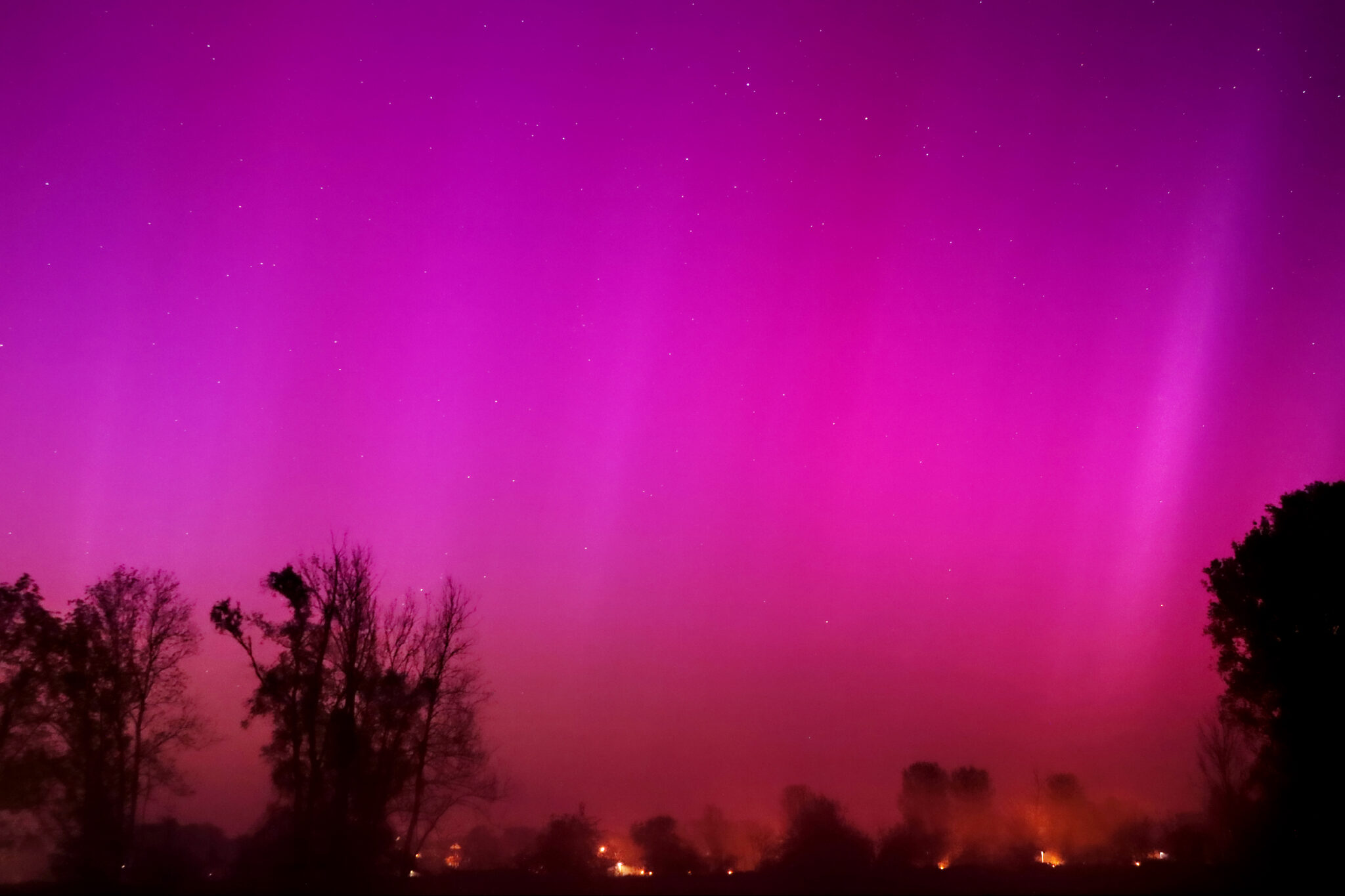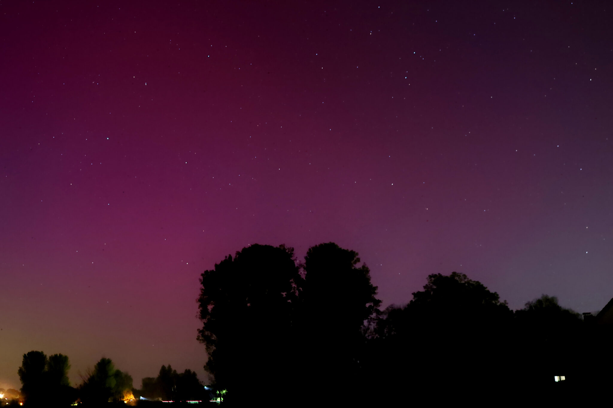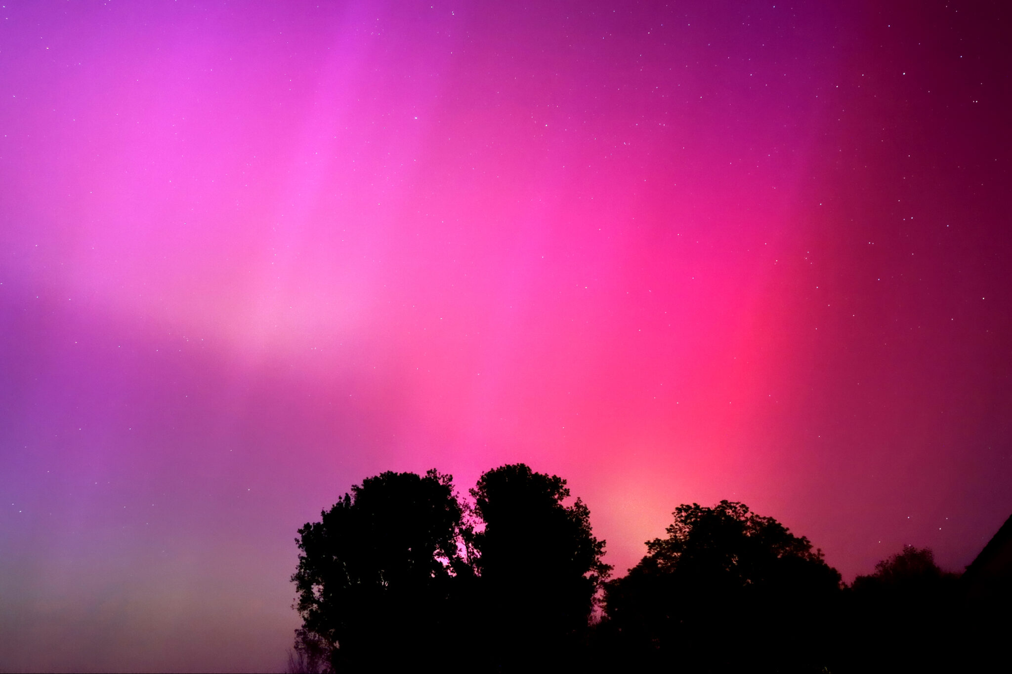 As a result of the strong interaction of the solar wind with the Earth’s magnetic field, aurorae have been observed far outside the usual polar regions. In Central Europe and parts of Germany, distinct auroral emissions were visible, primarily in the red spectral range (oxygen emission at 630.0 nm), locally supplemented by greenish structures (557.7 nm). Even in Germany, the phenomena were visible to the naked eye. The intensity, duration, and geographical extent of this event make the aurora night of 10/11. May 2024 will be one of the most significant aurora events in the past few decades in mid-latitudes. With a Canon 750D and an EFS 18-55mm wide-angle lens, I took around 300 individual shots that captured the fascinating play of colors in the sky, with red, violet, and green hues.