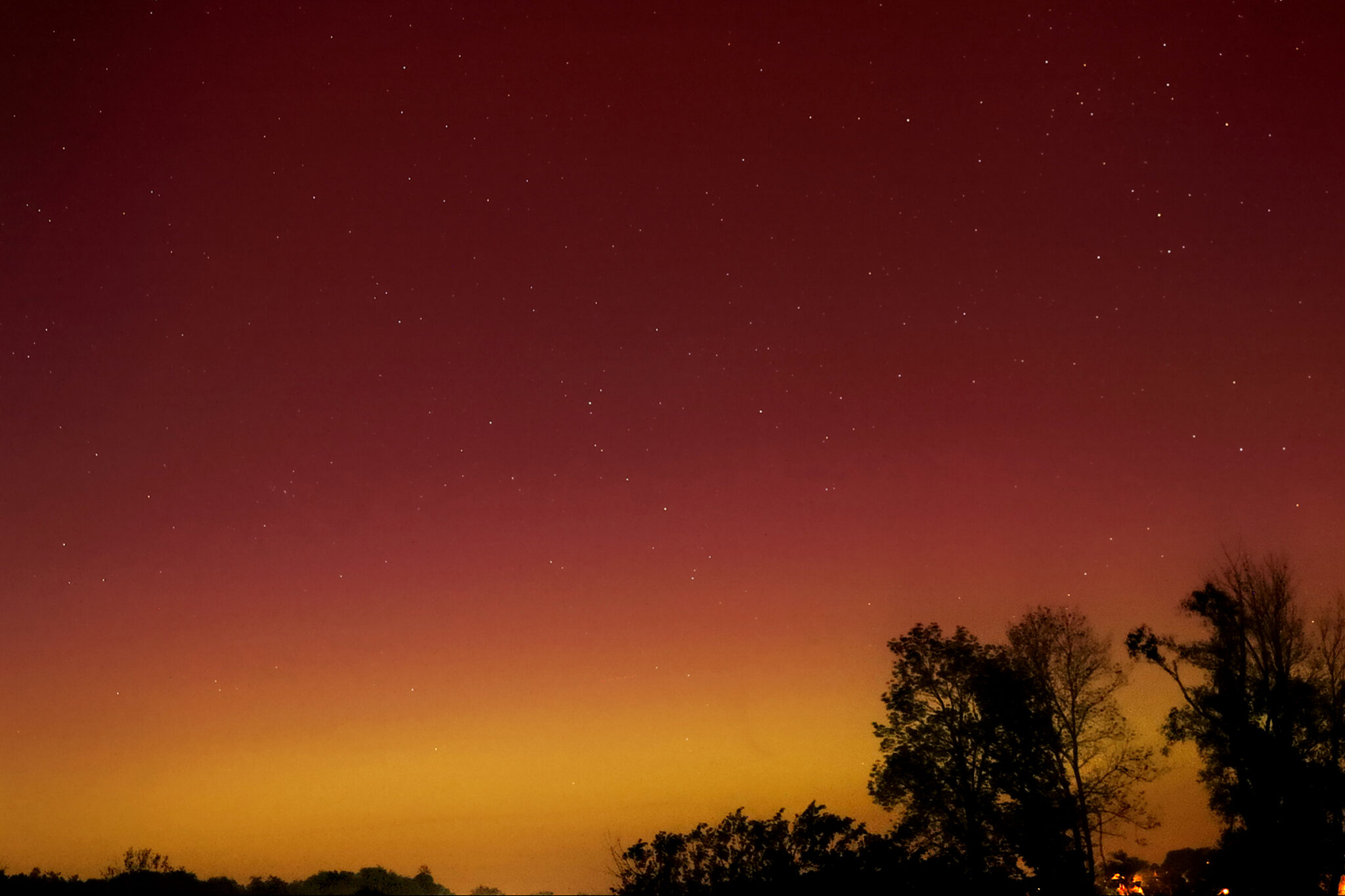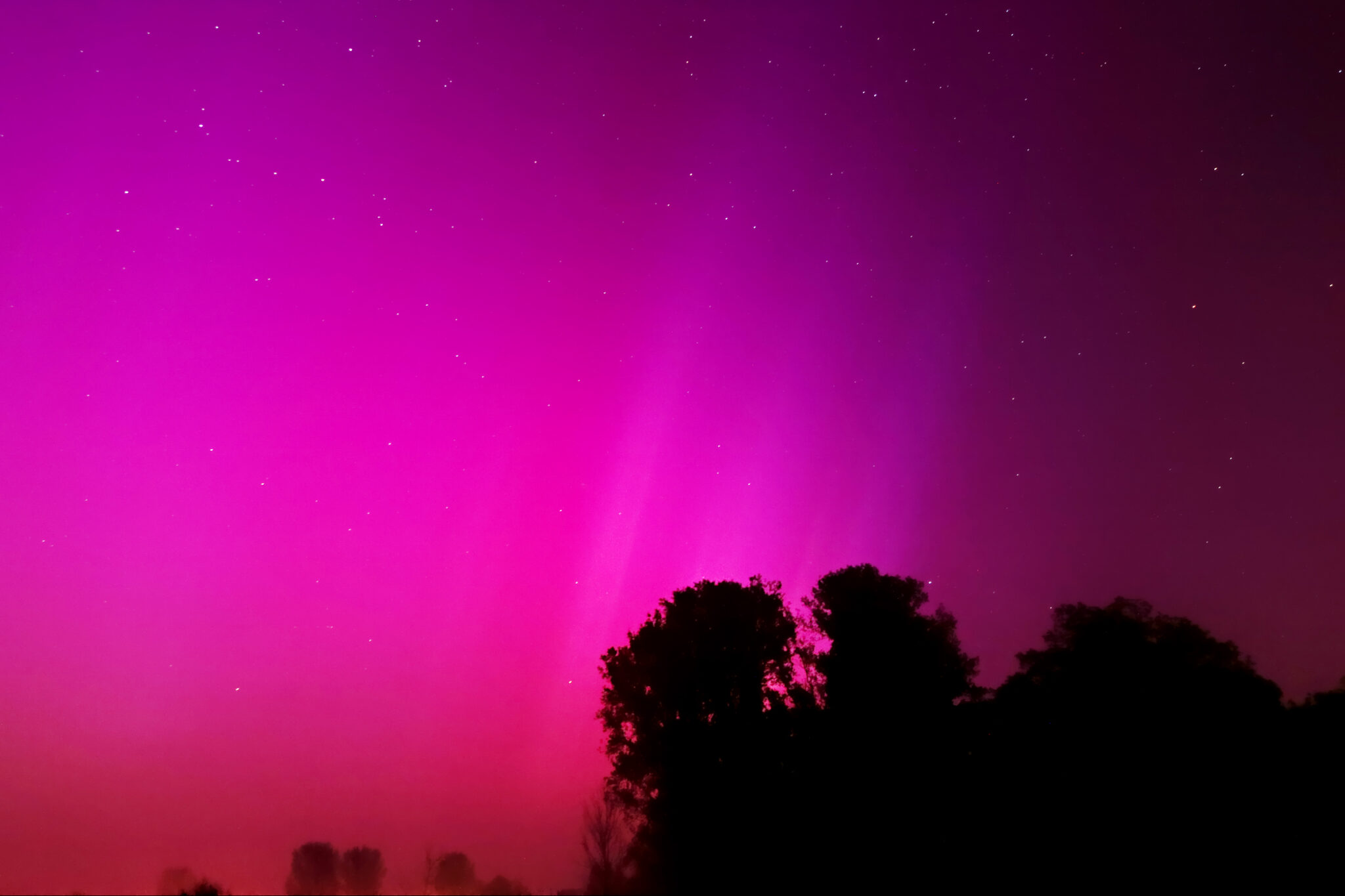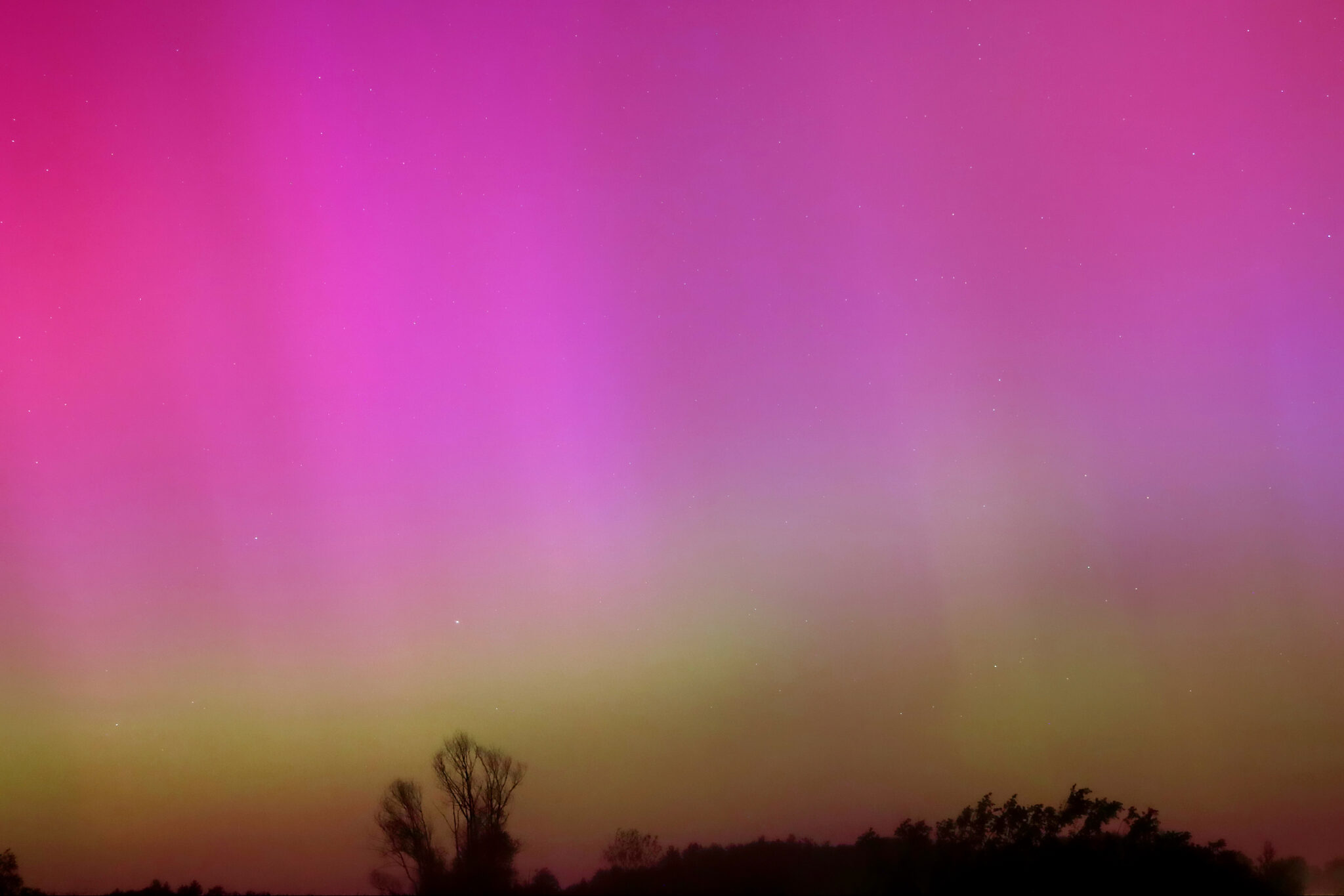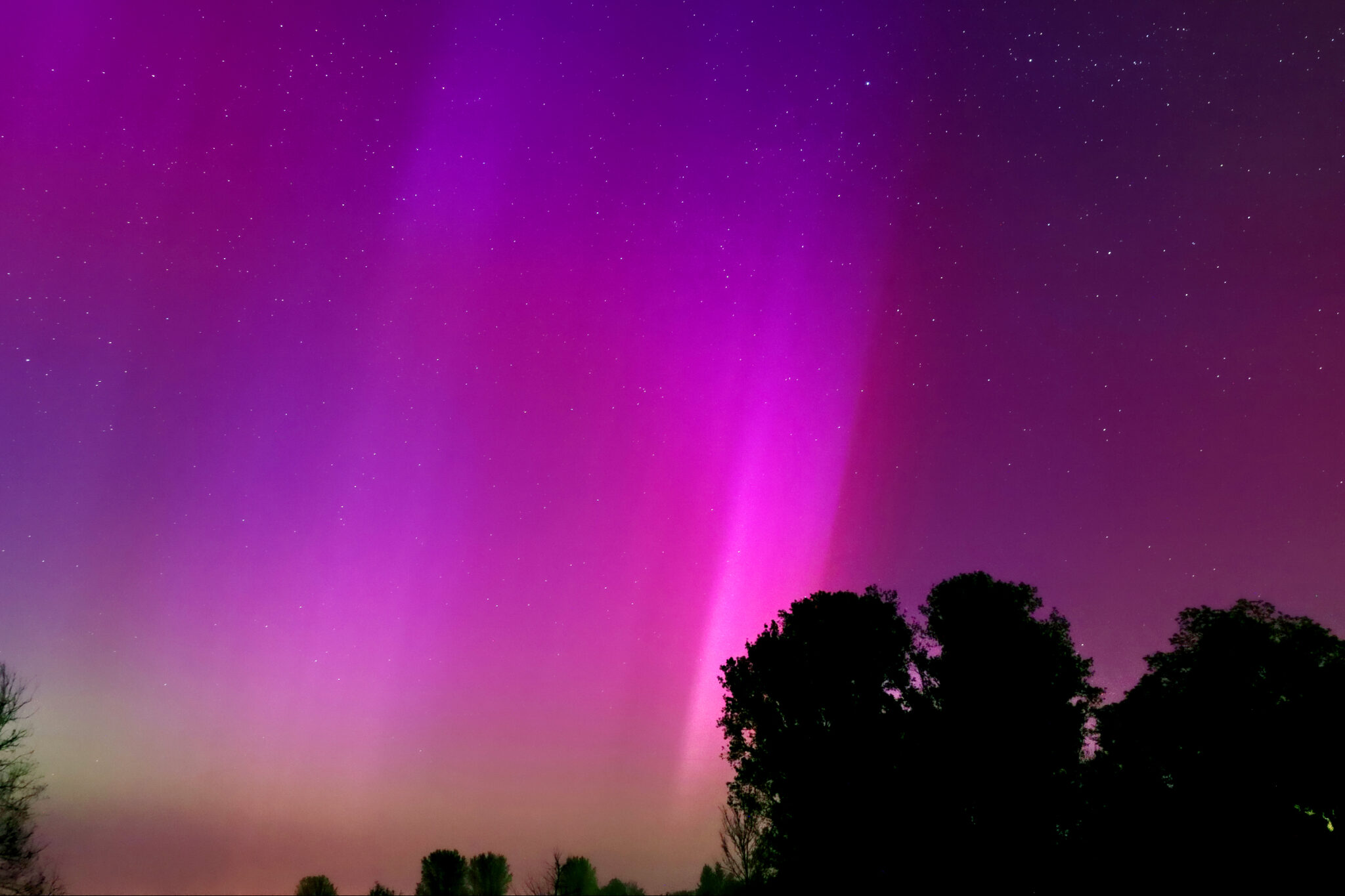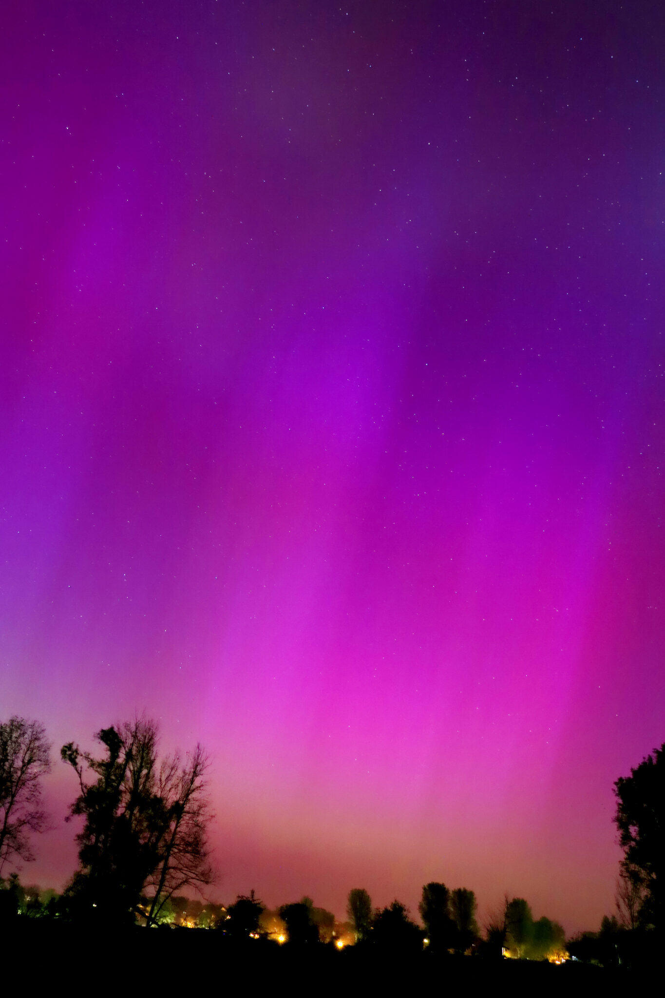 As a result of the strong interaction of the solar wind with the Earth’s magnetic field, aurorae have been observed far outside the usual polar regions. In Central Europe and parts of Germany, distinct auroral emissions were visible, primarily in the red spectral range (oxygen emission at 630.0 nm), locally supplemented by greenish structures (557.7 nm). Even in Germany, the phenomena were visible to the naked eye. The intensity, duration, and geographical extent of this event make the aurora night of 10/11. May 2024 will be one of the most significant aurora events in the past few decades in mid-latitudes. With a Canon 750D and an EFS 18-55mm wide-angle lens, I took around 300 individual shots that captured the fascinating play of colors in the sky, with red, violet, and green hues.