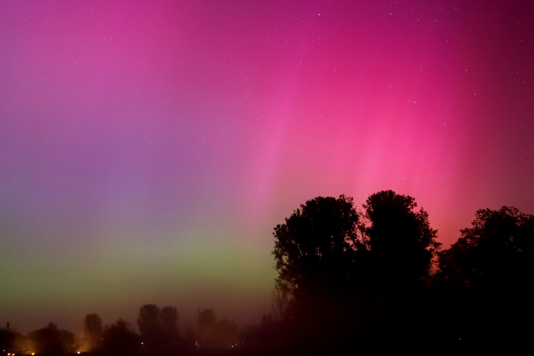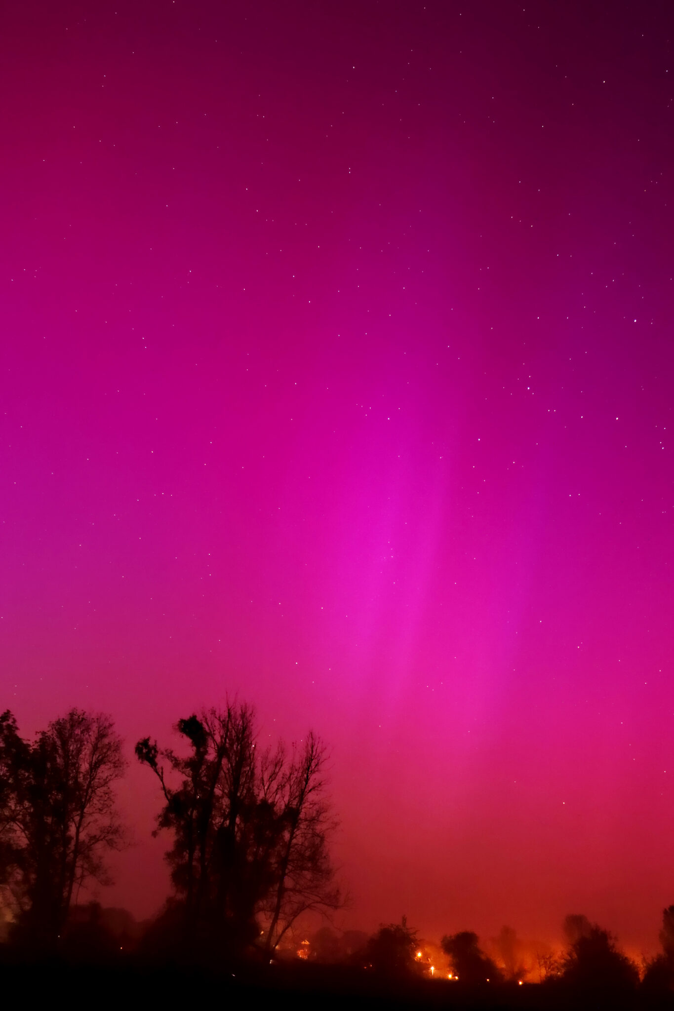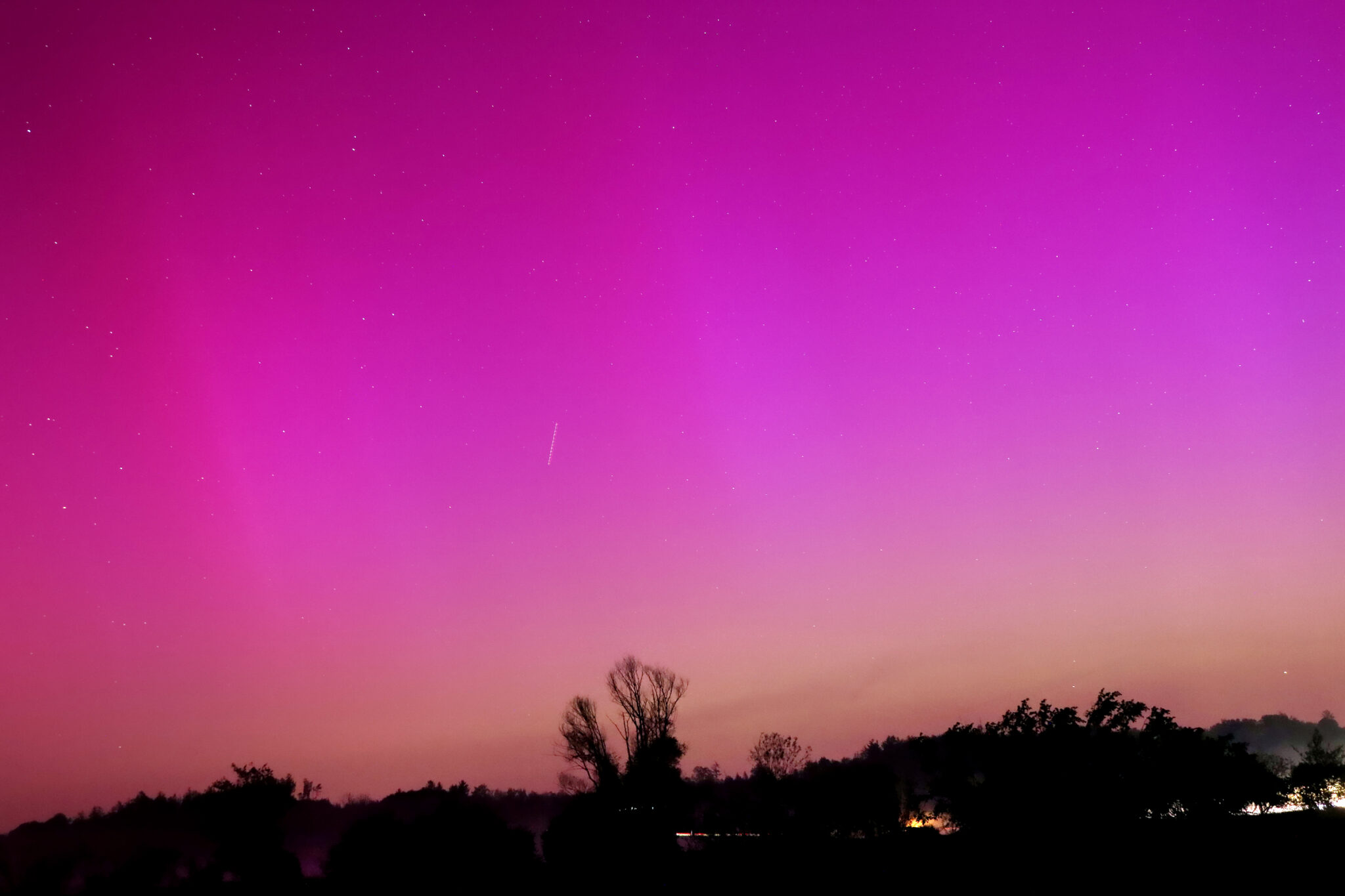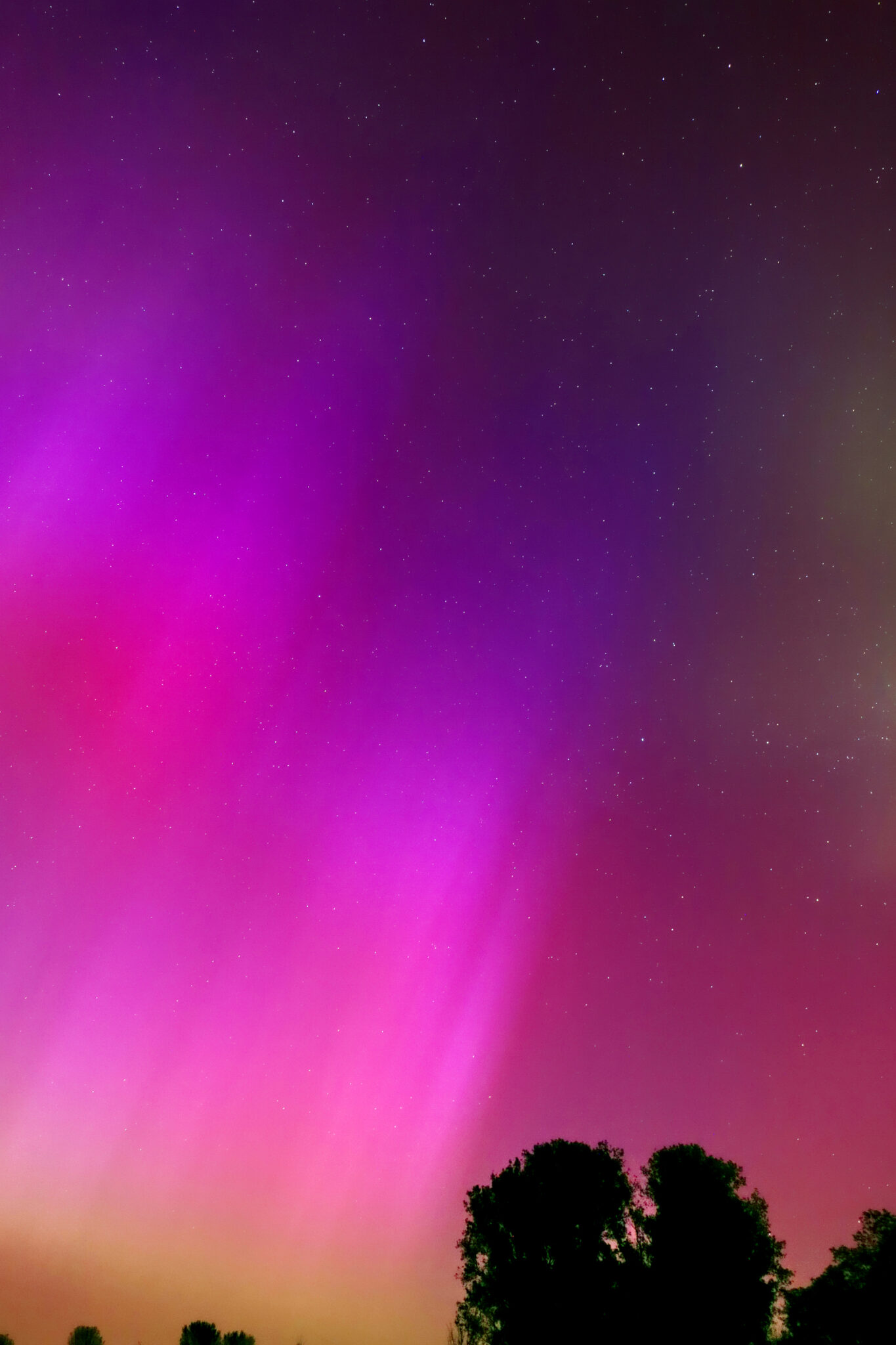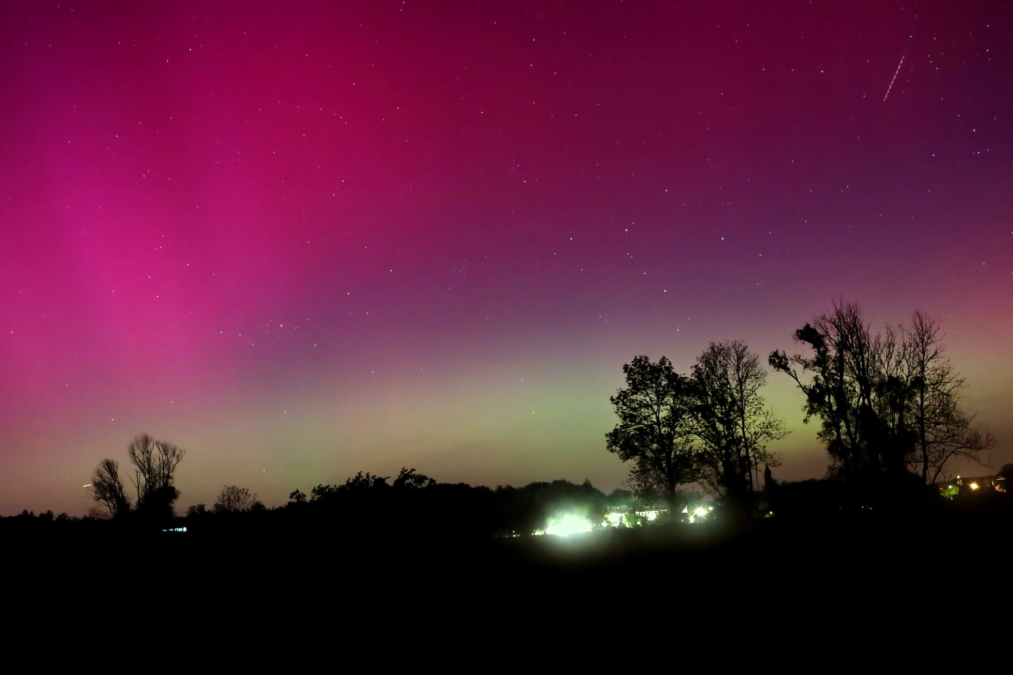As a result of the strong interaction of the solar wind with the Earth’s magnetic field, aurorae have been observed far outside the usual polar regions. In Central Europe and parts of Germany, distinct auroral emissions were visible, primarily in the red spectral range (oxygen emission at 630.0 nm), locally supplemented by greenish structures (557.7 nm). Even in Germany, the phenomena were visible to the naked eye. The intensity, duration, and geographical extent of this event make the aurora night of 10/11. May 2024 will be one of the most significant aurora events in the past few decades in mid-latitudes. With a Canon 750D and an EFS 18-55mm wide-angle lens, I took around 300 individual shots that captured the fascinating play of colors in the sky, with red, violet, and green hues.