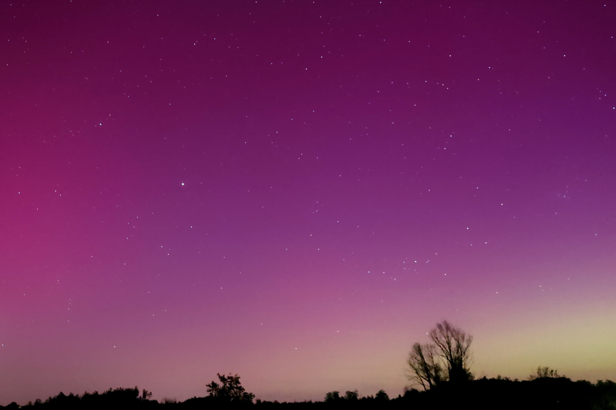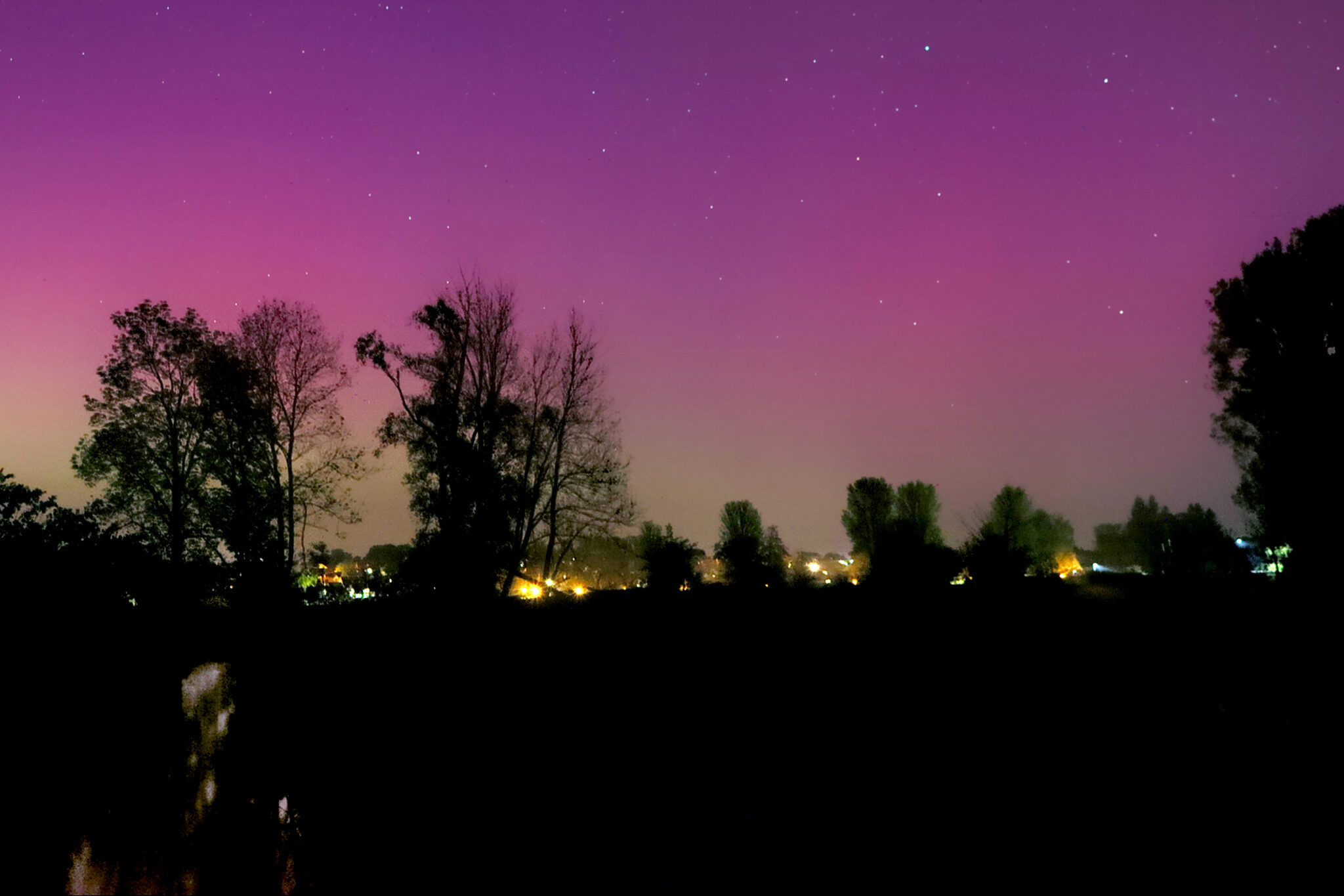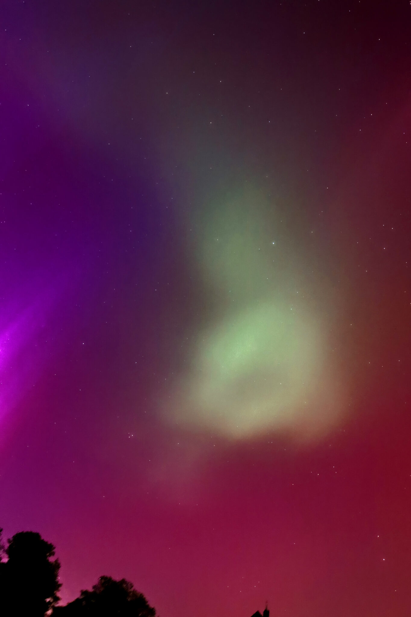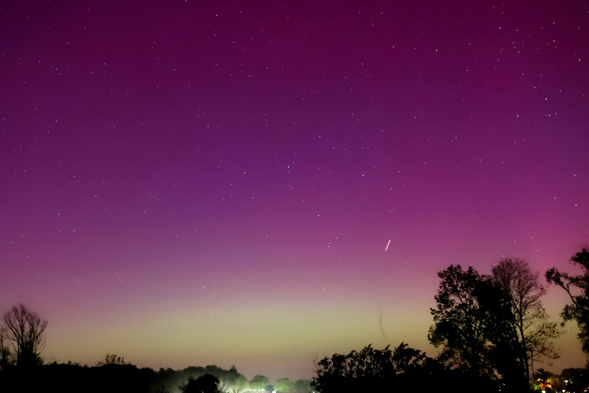 As a result of the strong interaction of the solar wind with the Earth’s magnetic field, aurorae have been observed far outside the usual polar regions. In Central Europe and parts of Germany, distinct auroral emissions were visible, primarily in the red spectral range (oxygen emission at 630.0 nm), locally supplemented by greenish structures (557.7 nm). Even in Germany, the phenomena were visible to the naked eye. The intensity, duration, and geographical extent of this event make the aurora night of 10/11. May 2024 will be one of the most significant aurora events in the past few decades in mid-latitudes. With a Canon 750D and an EFS 18-55mm wide-angle lens, I took around 300 individual shots that captured the fascinating play of colors in the sky, with red, violet, and green hues.
