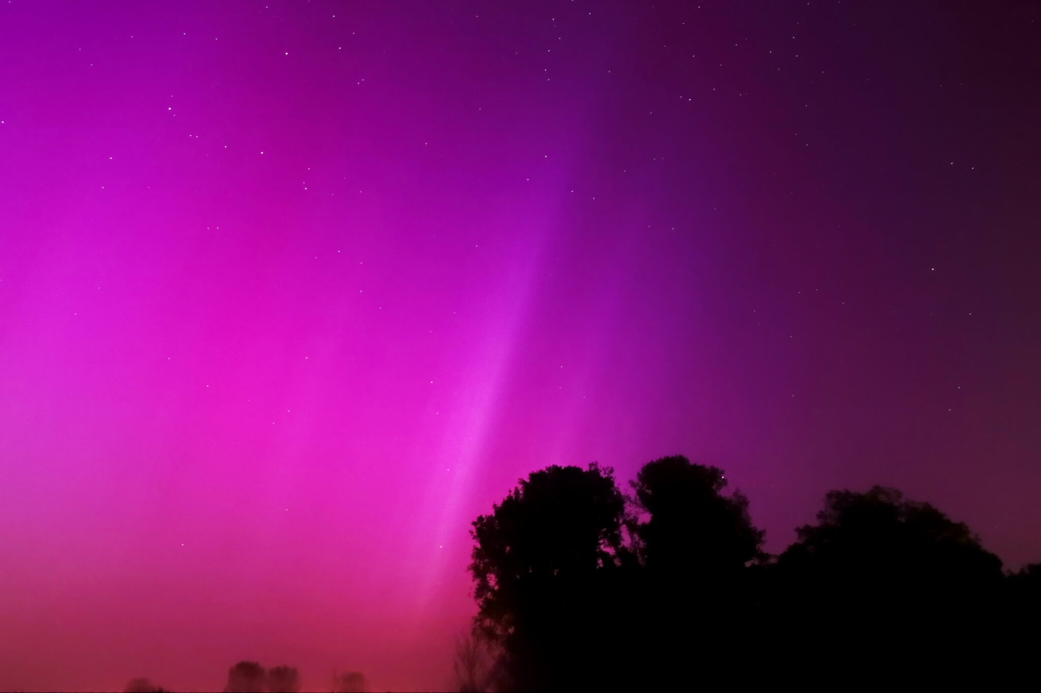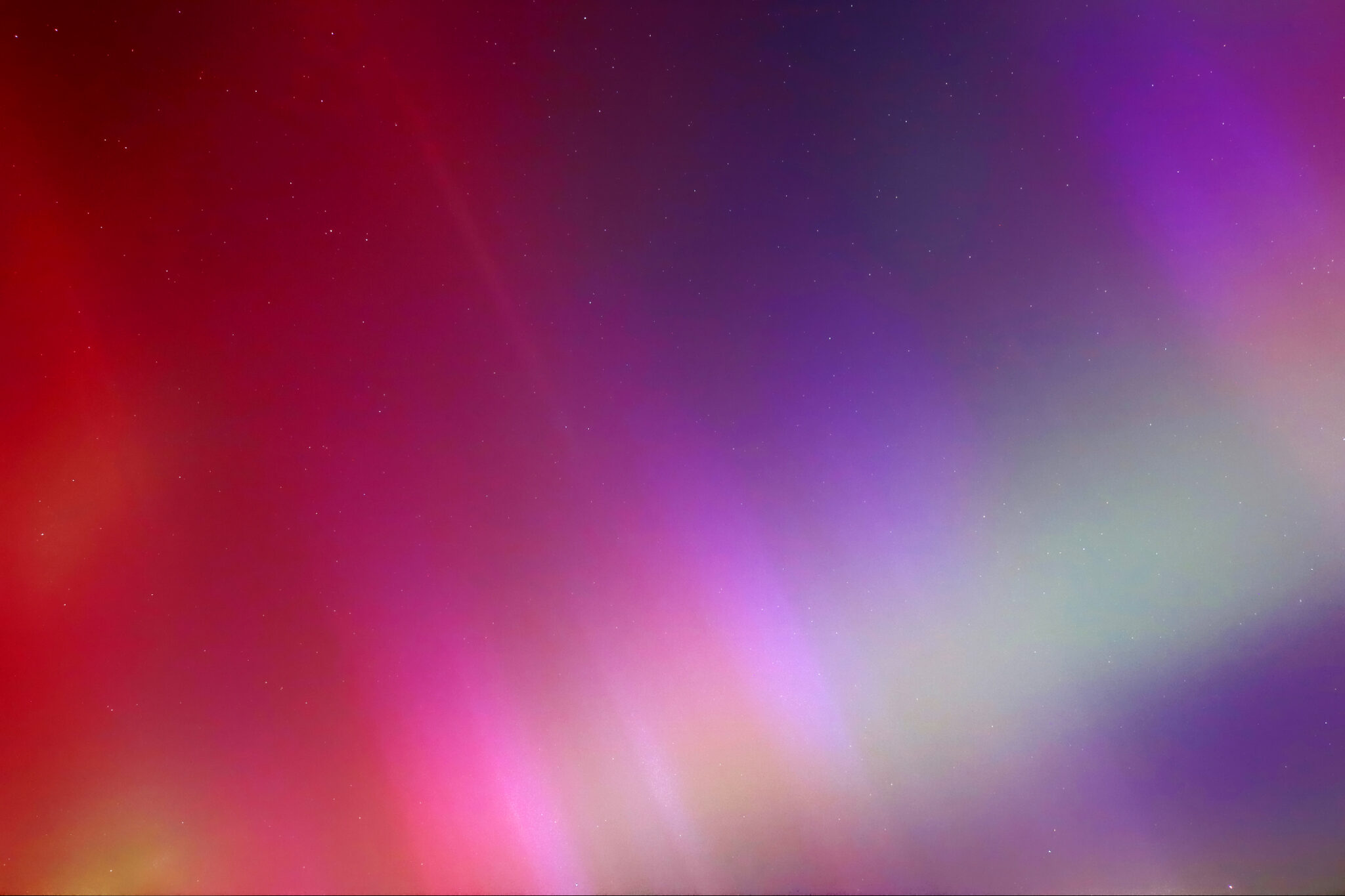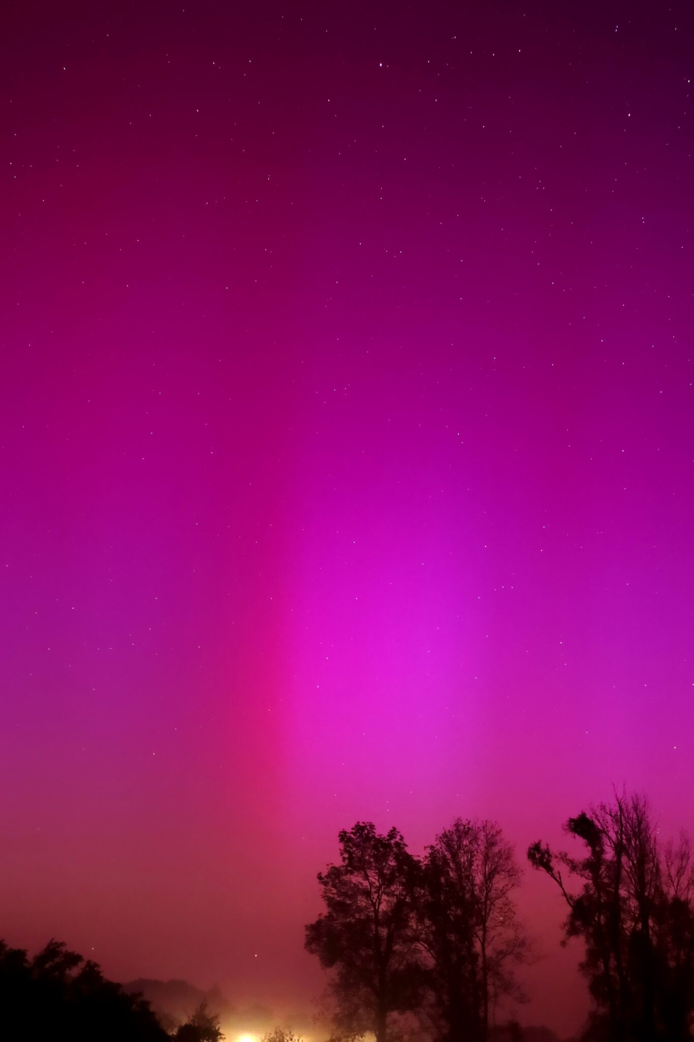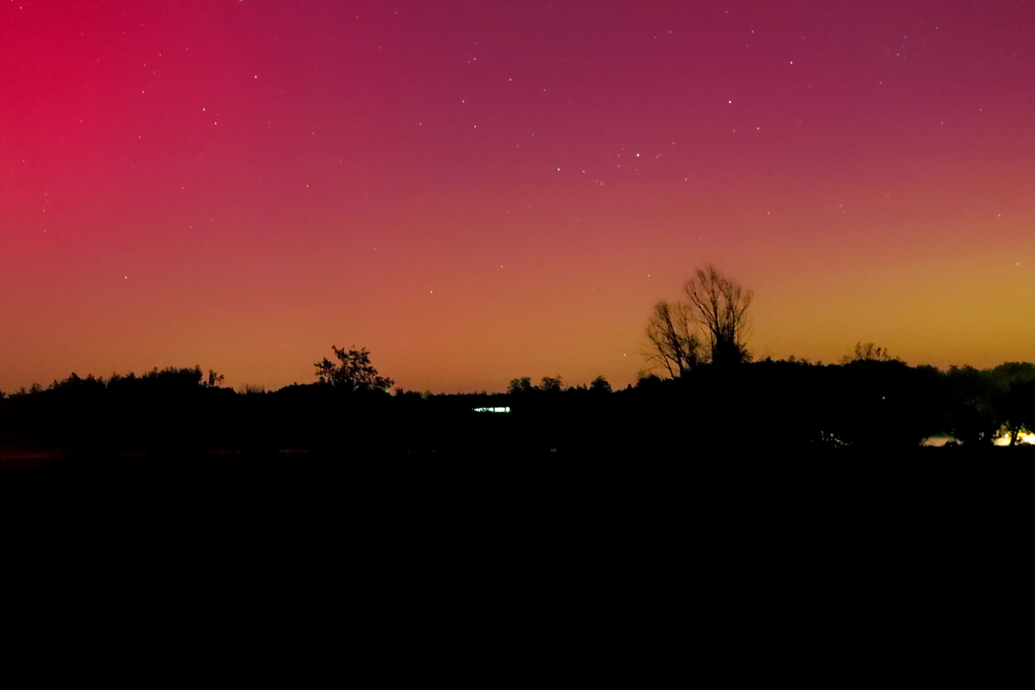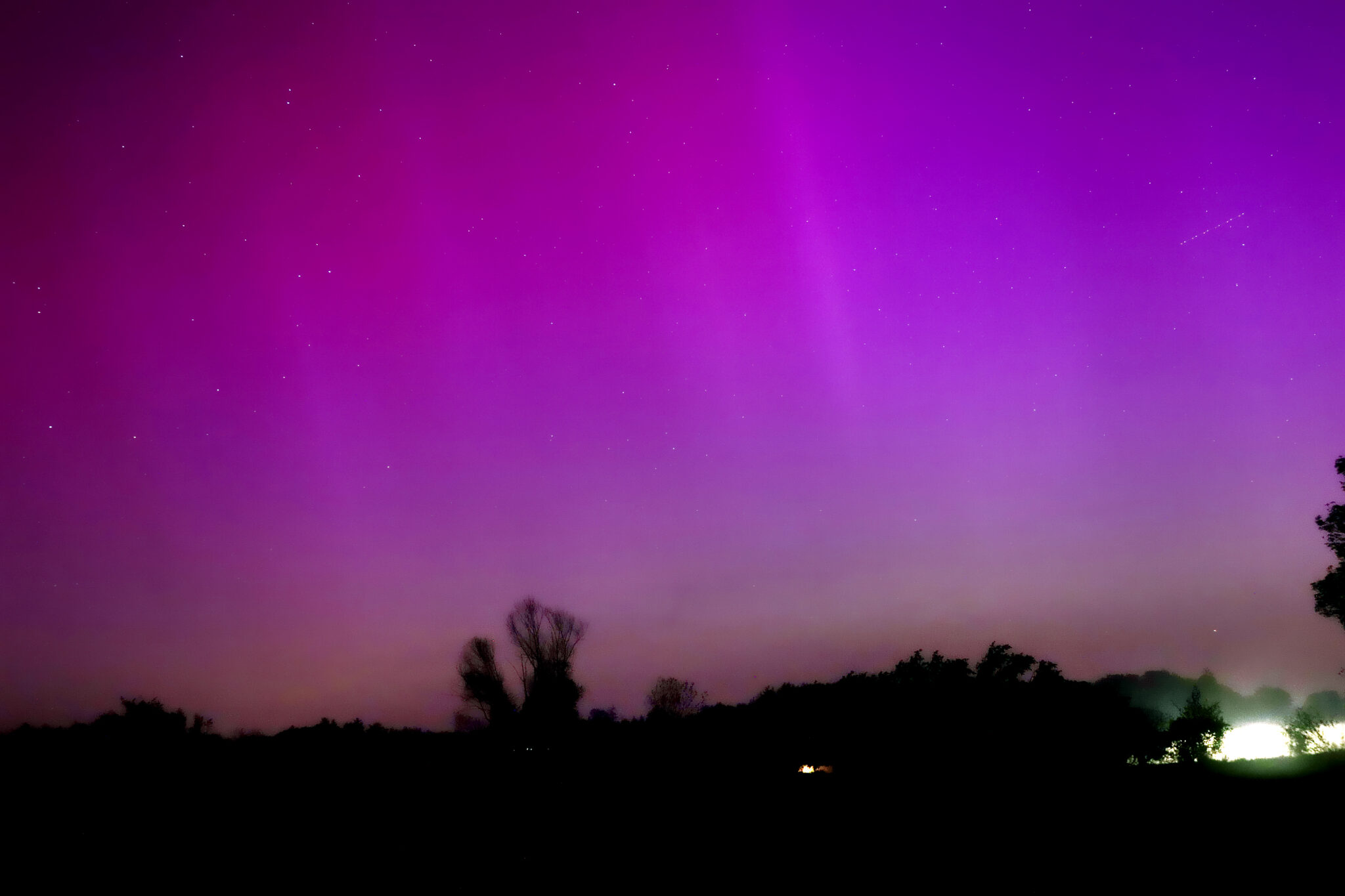As a result of the strong interaction of the solar wind with the Earth’s magnetic field, aurorae have been observed far outside the usual polar regions. In Central Europe and parts of Germany, distinct auroral emissions were visible, primarily in the red spectral range (oxygen emission at 630.0 nm), locally supplemented by greenish structures (557.7 nm). Even in Germany, the phenomena were visible to the naked eye. The intensity, duration, and geographical extent of this event make the aurora night of 10/11. May 2024 will be one of the most significant aurora events in the past few decades in mid-latitudes. With a Canon 750D and an EFS 18-55mm wide-angle lens, I took around 300 individual shots that captured the fascinating play of colors in the sky, with red, violet, and green hues.