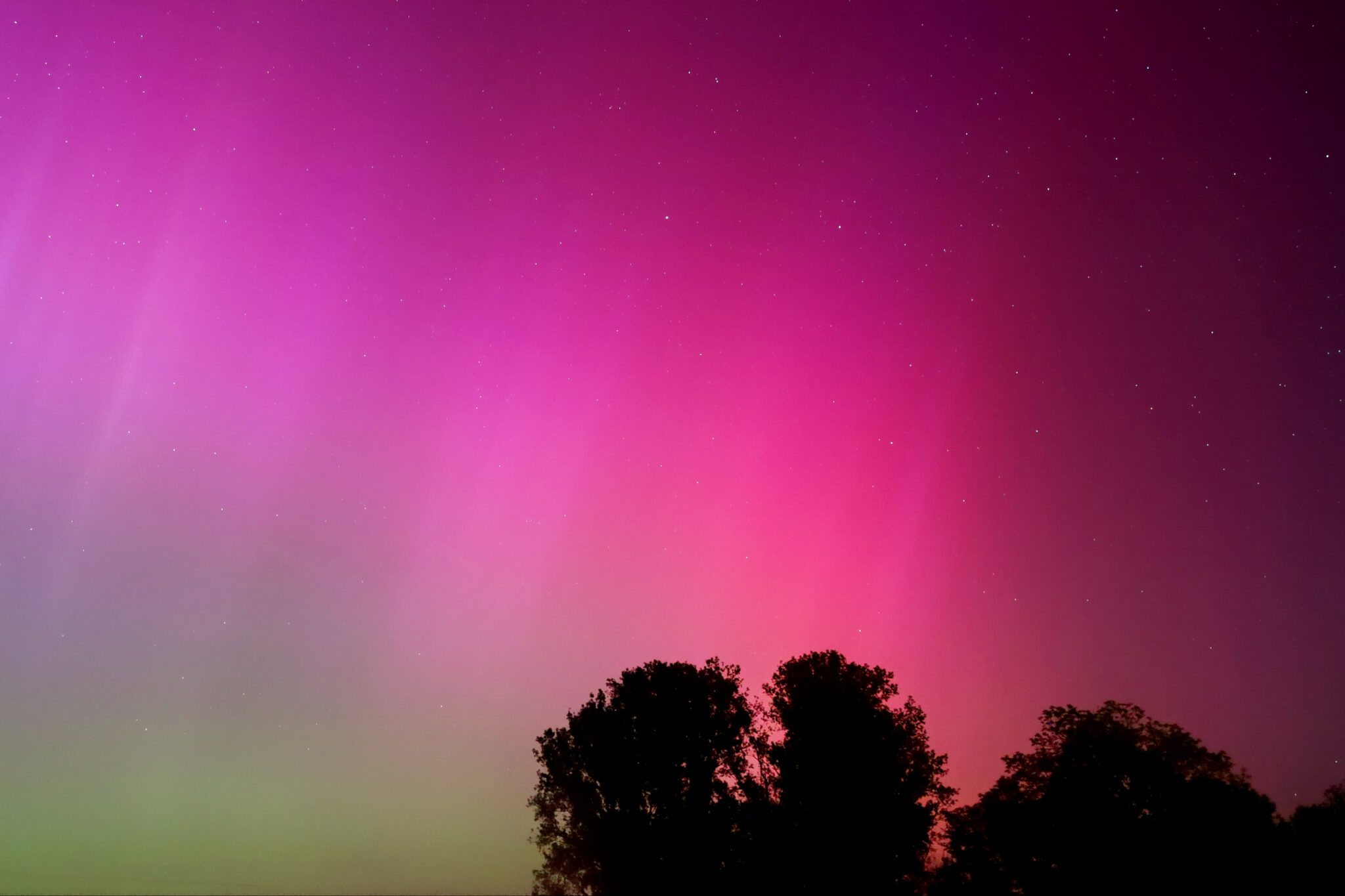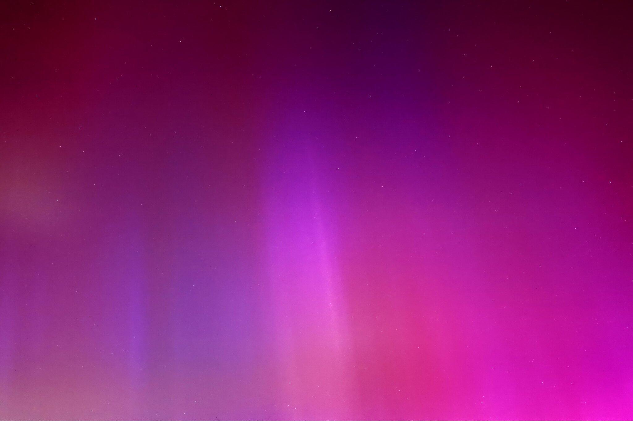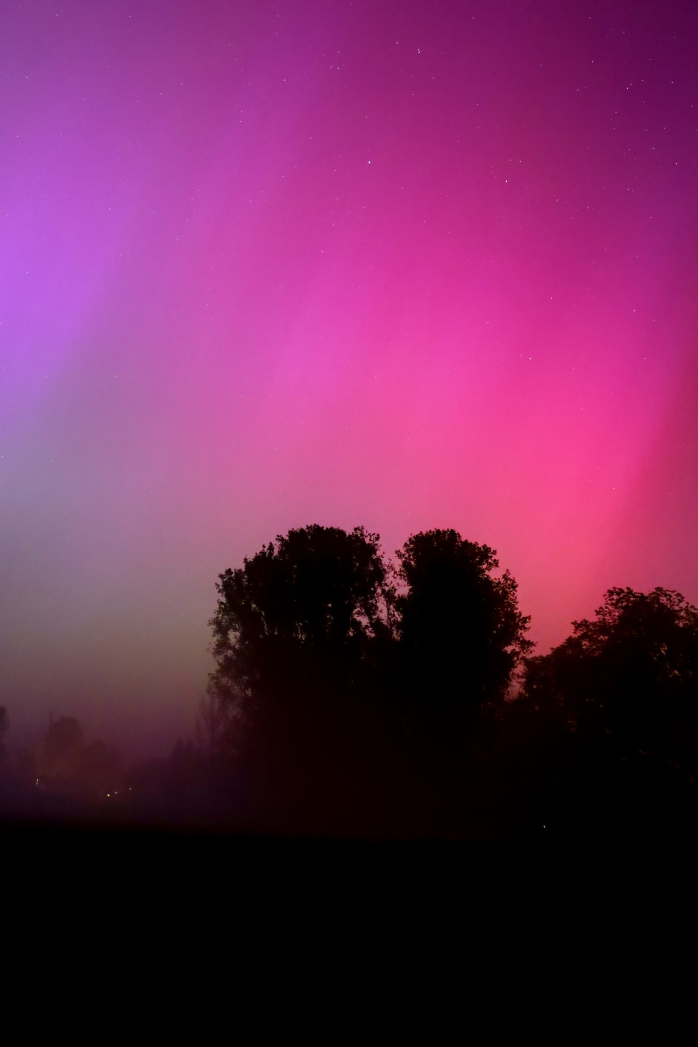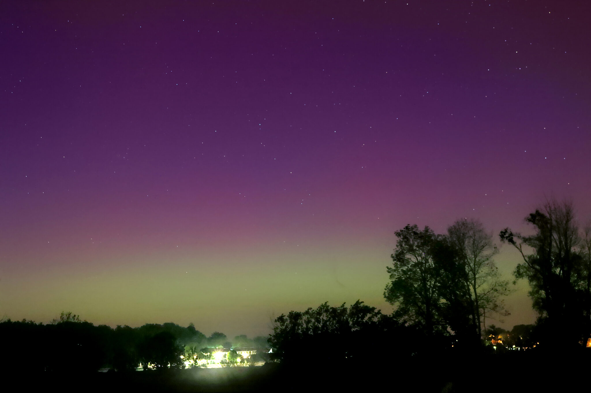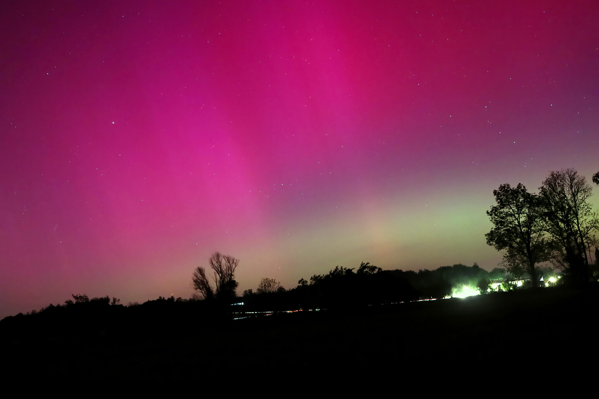 As a result of the strong interaction of the solar wind with the Earth’s magnetic field, aurorae have been observed far outside the usual polar regions. In Central Europe and parts of Germany, distinct auroral emissions were visible, primarily in the red spectral range (oxygen emission at 630.0 nm), locally supplemented by greenish structures (557.7 nm). Even in Germany, the phenomena were visible to the naked eye. The intensity, duration, and geographical extent of this event make the aurora night of 10/11. May 2024 will be one of the most significant aurora events in the past few decades in mid-latitudes. With a Canon 750D and an EFS 18-55mm wide-angle lens, I took around 300 individual shots that captured the fascinating play of colors in the sky, with red, violet, and green hues.