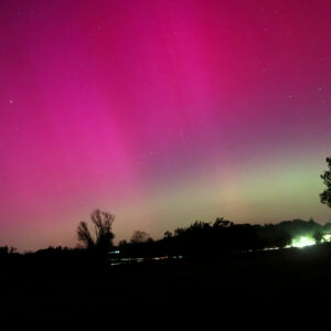 On the night of May 10/11, 2024, an extremely strong geomagnetic storm reached Earth, triggered by several coronal mass ejections (CMEs) that erupted from the sun in quick succession. The activity index (Kp index) reached a G-scale value of G5 (extreme) with a Kp index of 9, corresponding to a severe to extreme geomagnetic storm. When this stream of particles hits the Earth’s magnetic field, it is directed towards the poles. There, particles at an altitude of approximately 100 to 300 kilometers stimulate the molecules of the upper atmosphere to glow – mainly oxygen and nitrogen. The different colors are created by interactions between charged particles from the sun and the Earth’s magnetic field and atmosphere. The primary colors of the aurora are green, red, and purple. Green auroras are created when charged particles, mainly electrons, collide with oxygen molecules at an altitude of about 100 to 240 kilometers above the Earth’s surface. In these collisions, the energy of the electrons is transferred to the oxygen molecules, which then release this energy in the form of green light. Red auroras are created by the interaction of charged particles with oxygen and nitrogen molecules at high altitudes between 240 and 320 kilometers.